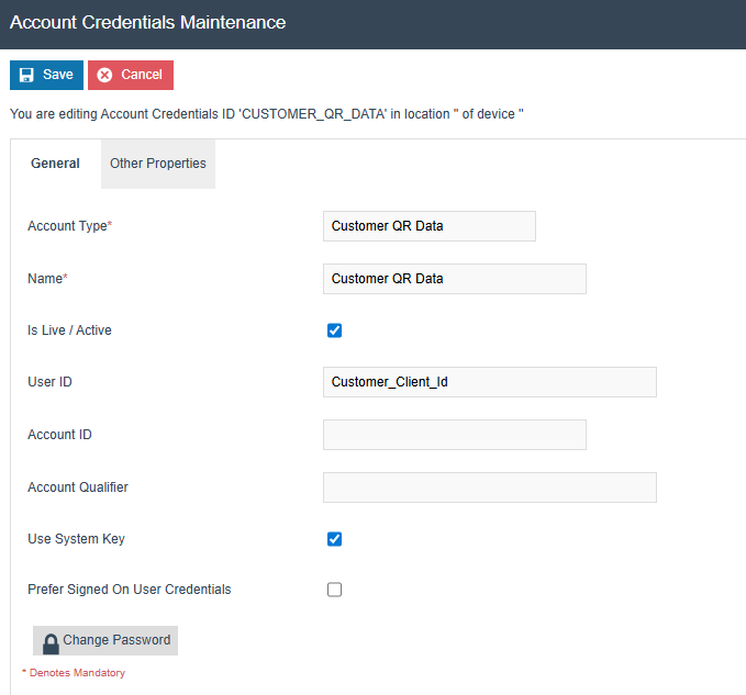Create a new Account Credentials with the ID of CUSTOMER_QR_DATA and enter the following: