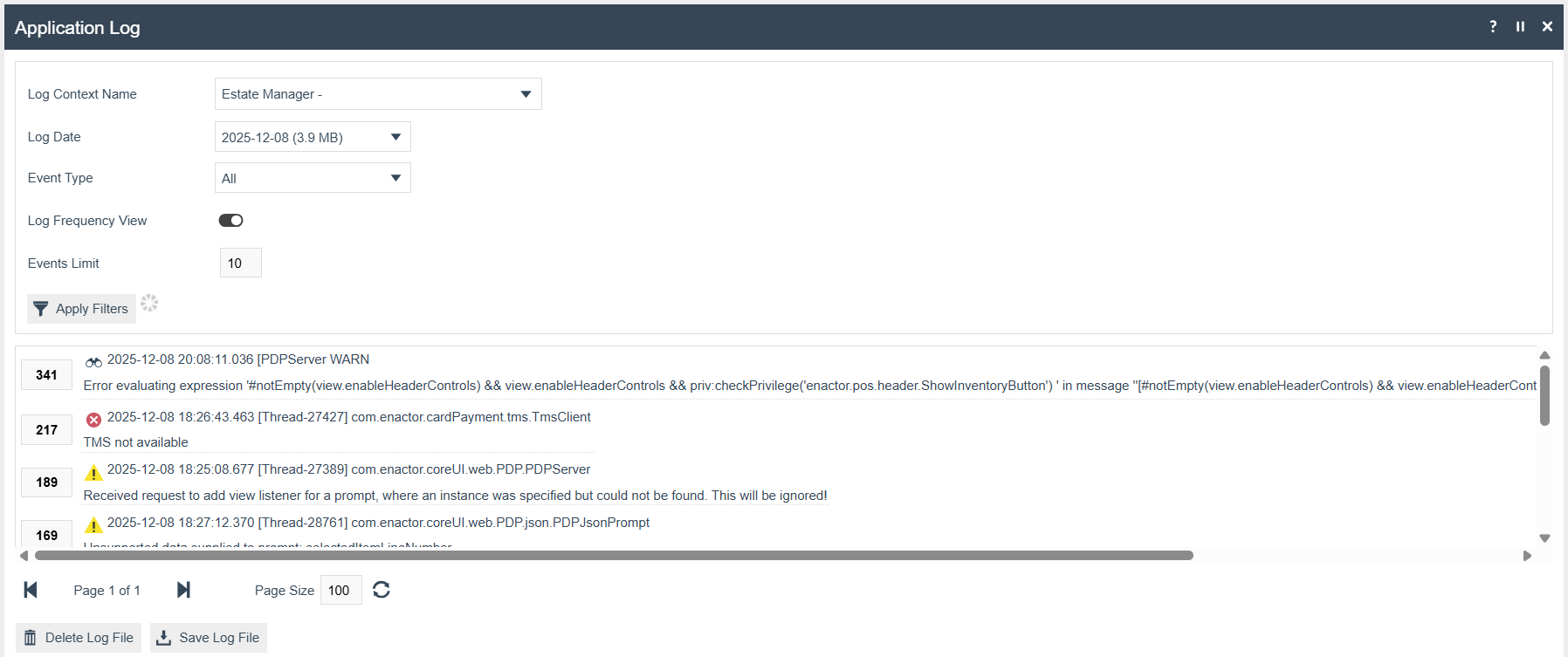 - Navigate: Go to the Application Log Maintenance page (Estate Manager > Administration > Logs > Application Log).