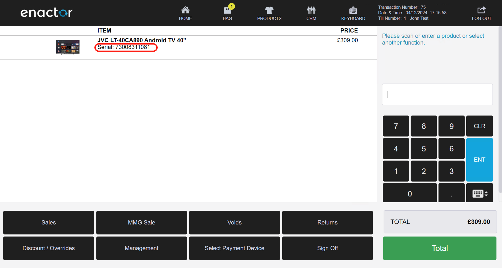 The 'Prompt for Serial Number' option should be checked - when this product's RFID tag is read, the serial number from it is captured and added to the transaction.