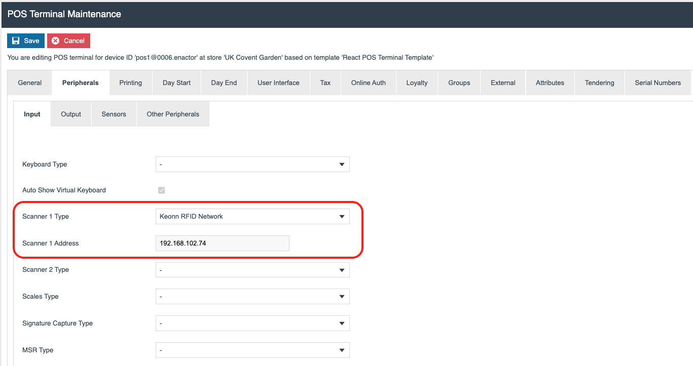 Edit the POS Terminal where the RFID reader is to be configured and select the Peripherals > Input tab.