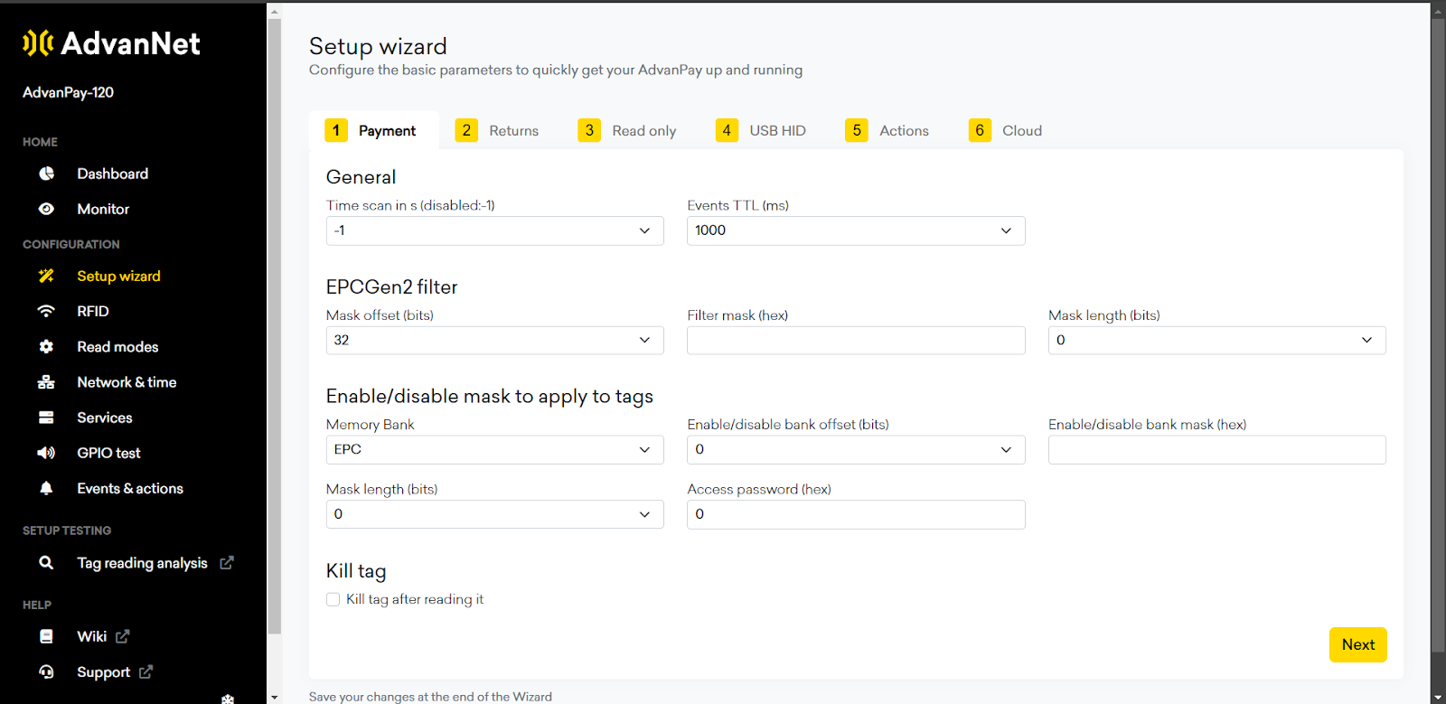 POS Terminal - Defines the RFID reader as a scanner and sets the IP address