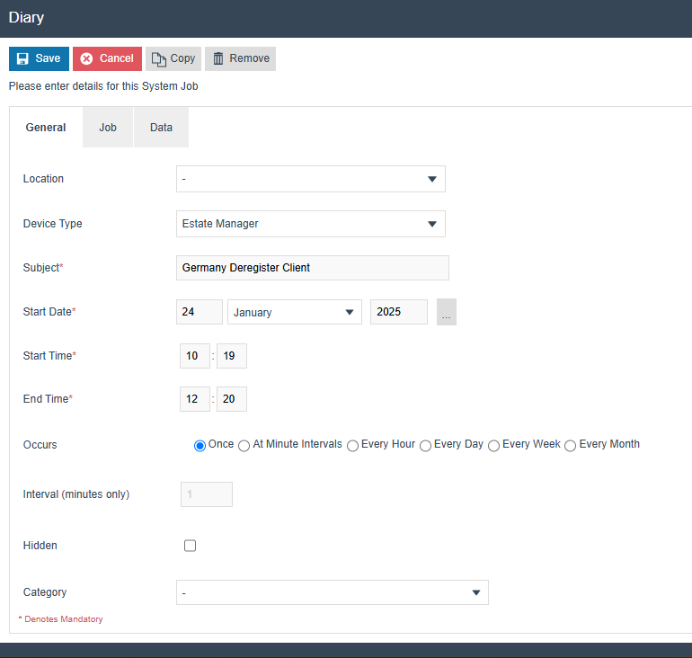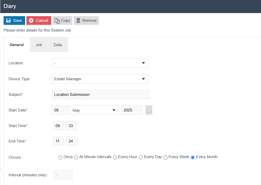 This diary entry will create a separate scheduled job for each selected location for that month's submission (i.e., locations with changes in commissioned clients, decommissioned clients, or establishment details).