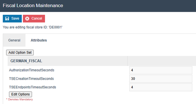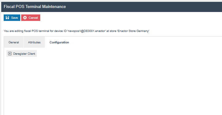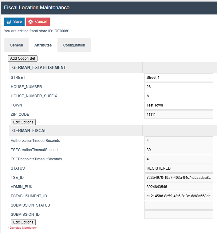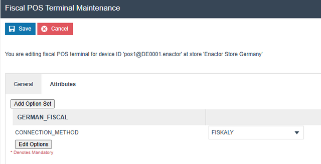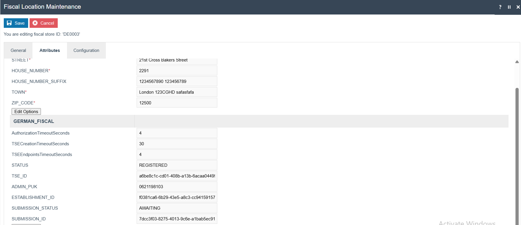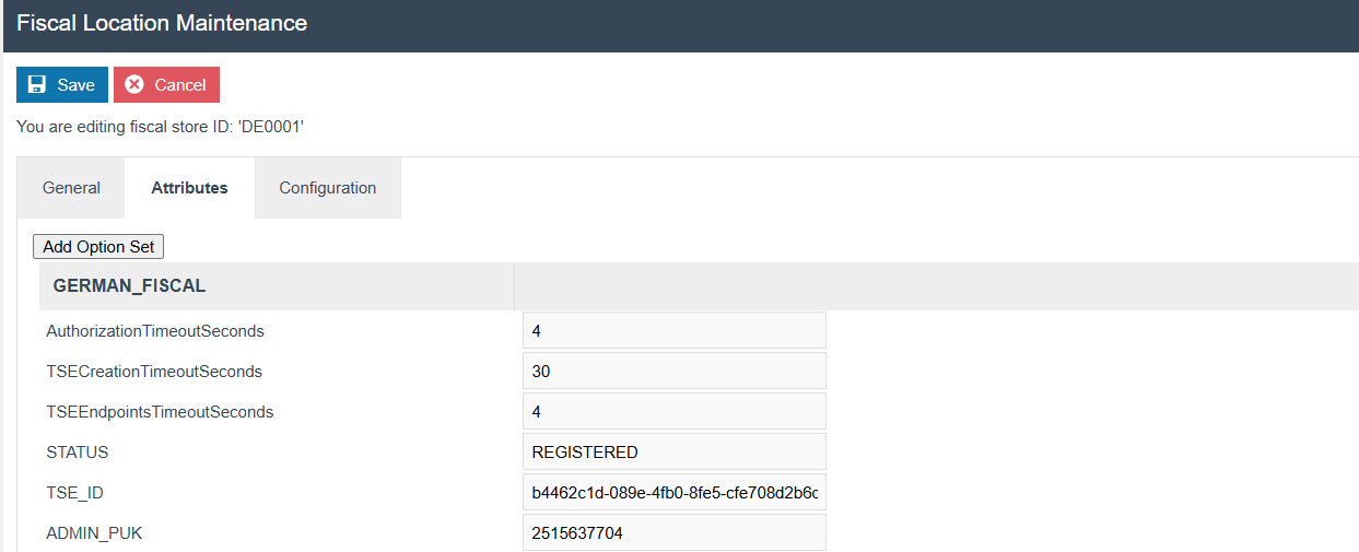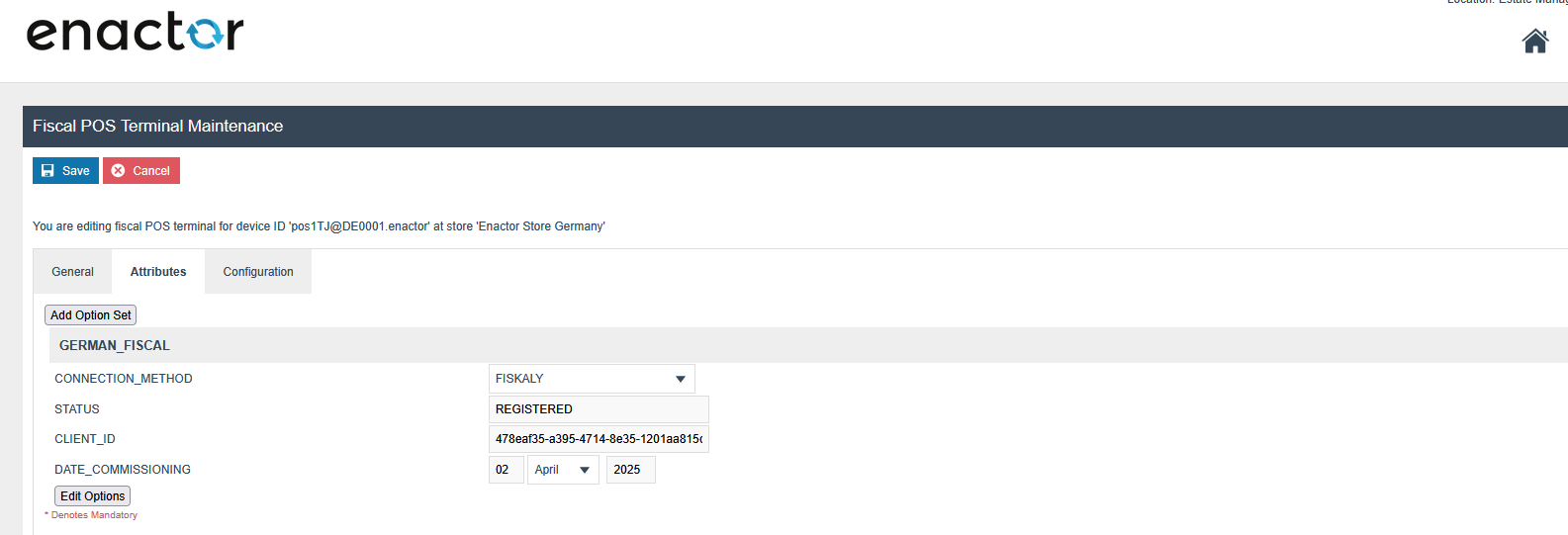 “Register Location And Devices” : This button creates an establishment and registers the TSE for the selected fiscal location and all associated clients as part of the location registration with Fiskaly. It will only be visible for unregistered live fiscal locations and to users with the "enactor.fiscal.fiskaly.RegisterLocationAndDevices" privilege. Establishment and TSE details will be saved within the Fiscal Location attributes and client details within the Fiscal POS Terminal attributes with the status as “REGISTERED” after the registration.