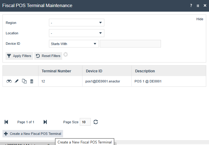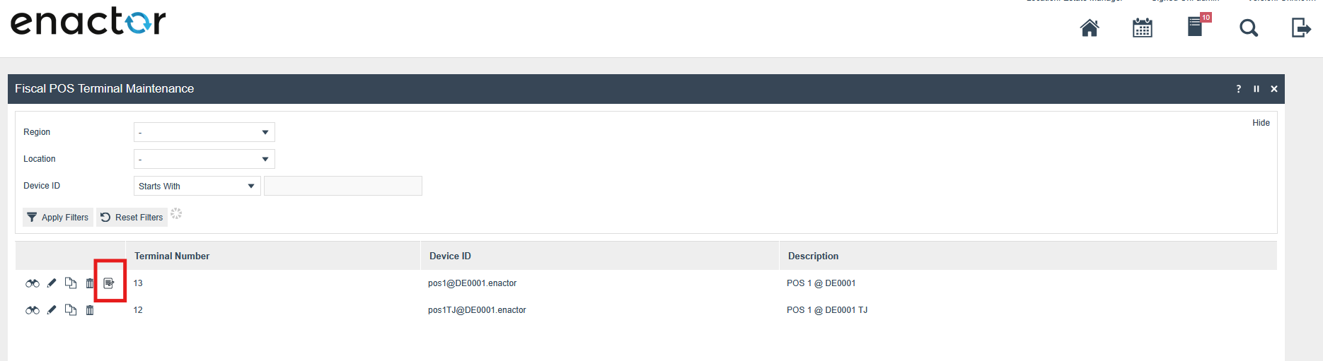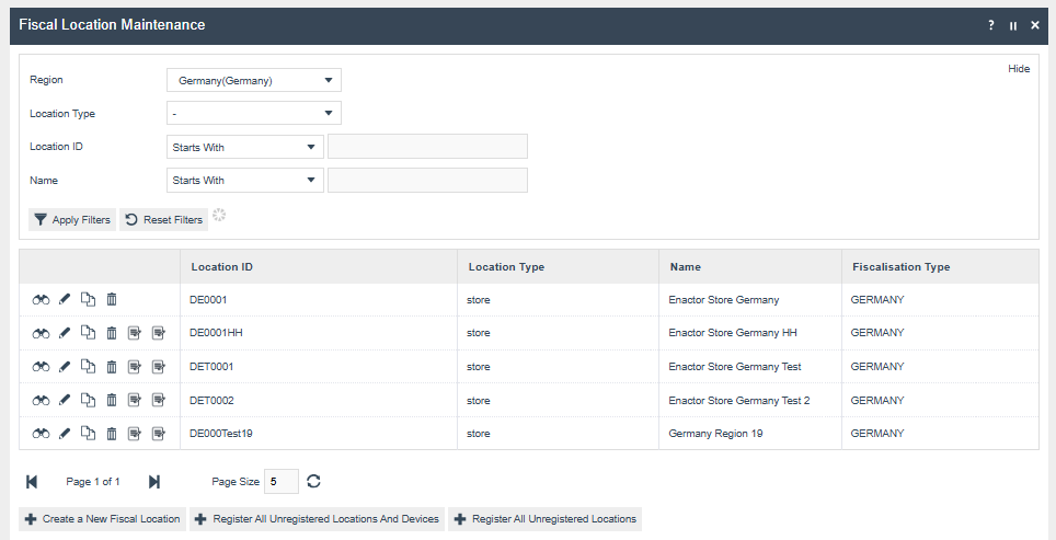 “Register Location” : This button creates an establishment and registers the selected fiscal location with Fiskaly, ensuring that only the TSE (Technische Sicherheitseinrichtung) for that location is registered, without registering the POS devices. This icon will be visible only for unregistered live fiscal locations and to users with the "enactor.fiscal.fiskaly.RegisterLocation" privilege. Establishment details and the TSE details will be saved within the Fiscal Location attributes with the status as “REGISTERED” after the registration.