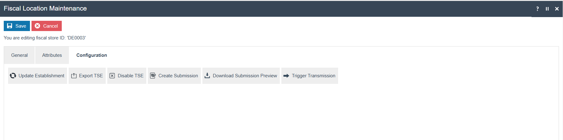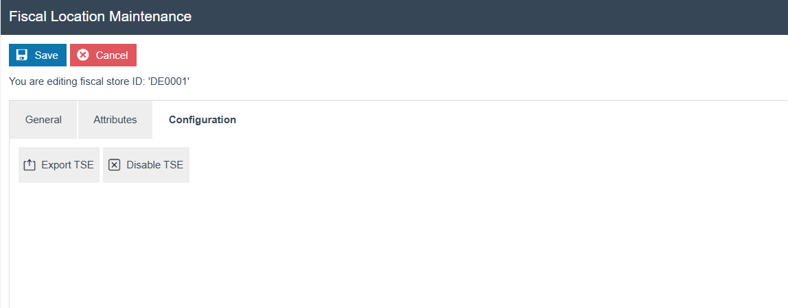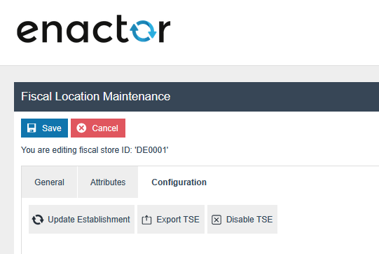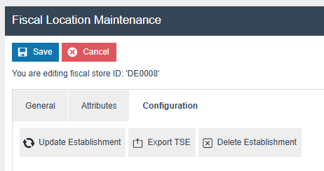 Once you have created an establishment and registered a fiscal location, it cannot be registered again to Fiskaly. So, the "Register Location" icon will be removed, and new icons named “Update Establishment”, "Export TSE" and "Disable TSE" buttons will appear within the Configuration tab.