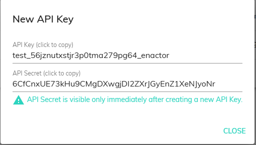 The new API Key and API Secret should be saved before closing this window, as the API Secret is only visible immediately after creating a new API Key.
