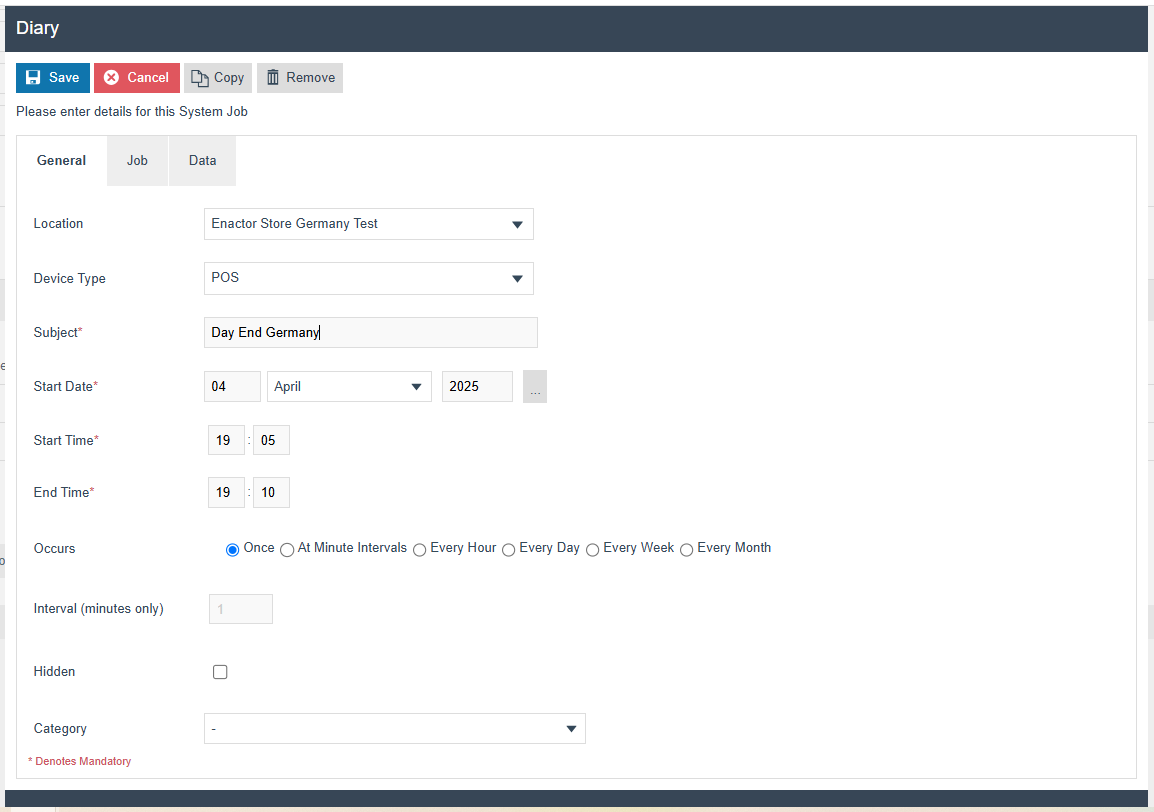 Configure the following Diary entry from the Diary Entry Maintenance, which will create a separate schedule job for each location that is identified with the change for that month
