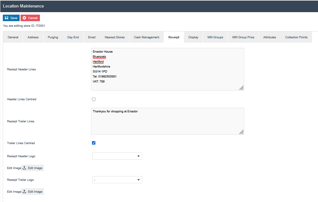 Location Maintenance → Receipt tab → Receipt Header Lines