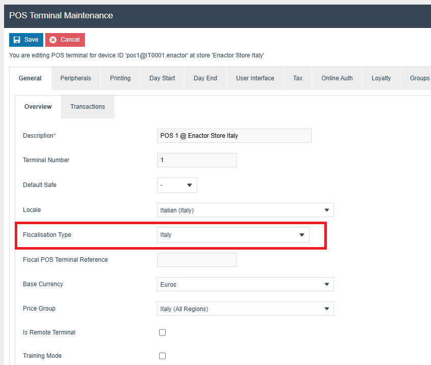 The POS Terminal Template used by all devices in Italy must be configured to have the fiscalisation Type set to Italy . Currency should be set to Euro and Locale to Italy . If a POS terminal configuration with the fiscalisation type set to Italy is broadcast to a POS device that does not have the Italy fiscal module installed the POS will fail to start. Similarly if a POS device with the Italy fiscal module installed is configured with anything but the Italy fiscalisation type the POS will also fail to start. This is to ensure that only versions of the enactor solution that have been certified for use in Italy are used in Italy .