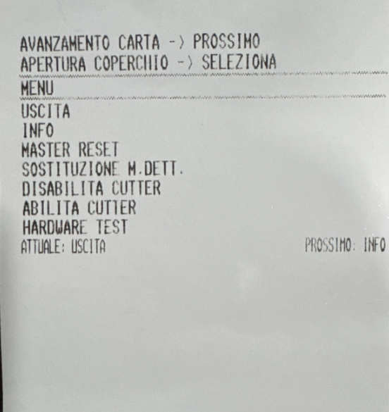 <creation factoryClass="com.custom.jpos.services.CustomJposServiceInstanceFactory" serviceClass="com.custom.jpos.services.FiscalPrinterService"/> <vendor name="Custom, SPA" url="http://www.custom.it"/\> <jpos category="FiscalPrinter" version="1.7"/> <product description="Custom FiscalPrinter from Custom Corporation" name="Custom FiscalPrinter Service for JavaPOS(TM) Standard" url="http://www.custom.it"/\> <prop name="deviceBus" type="String" value="Ethernet"/> <prop name="portName" type="String" value="172.16.251.124"/> <prop name="logStatusCommands" type="String" value="false"/> <prop name="deleteEmptyHeaderLines" type="String" value="false"/> <prop name="debugDll" type="String" value="true"/> </JposEntry> </JposEntries>” The value of the portName property should be the IP address of the physical printer. To find the printer IP address, refer to the device manual and follow the provided steps.- Turn the printer off and then back on using the power button.