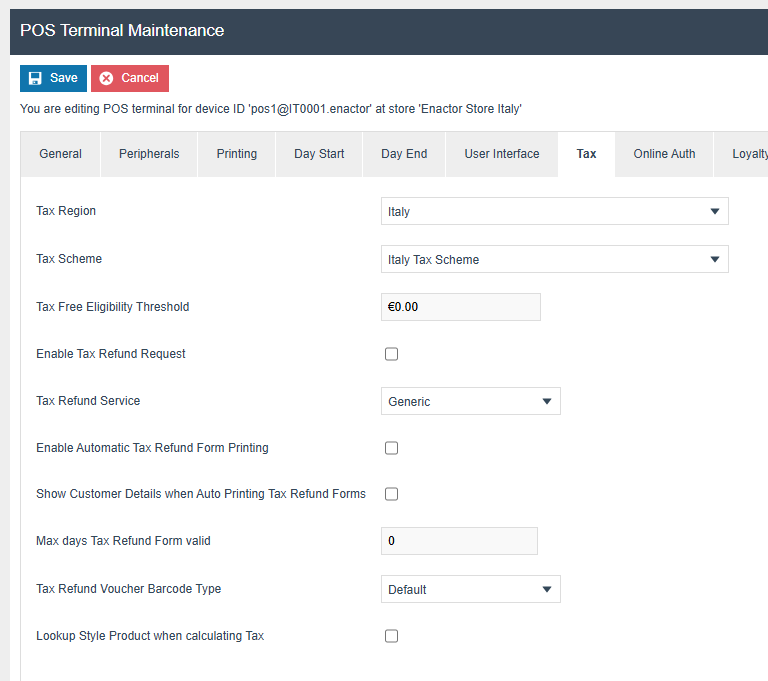 The following configuration changes are required and must be broadcast to all Italy devices in preparation for go live. Detailed steps for how to do this are contained in supplementary How to Guides available on the Enactor Insights portal, as well as being covered in the Introduction to Enactor training course. Although steps have been taken to ensure that the POS will not start or perform transactions without a valid configuration it is the retailers responsibility to ensure a valid configuration is present and not to try to circumnavigate any of the requirements of the Italy Fiscal Legislation through misconfiguration of the solution.