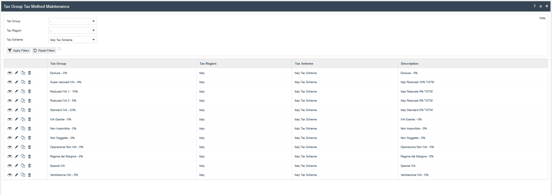 The following tax scheme should be configured and broadcast to the appropriate Italy devices. Make sure to add all the Tax Rates related to Italy as well.