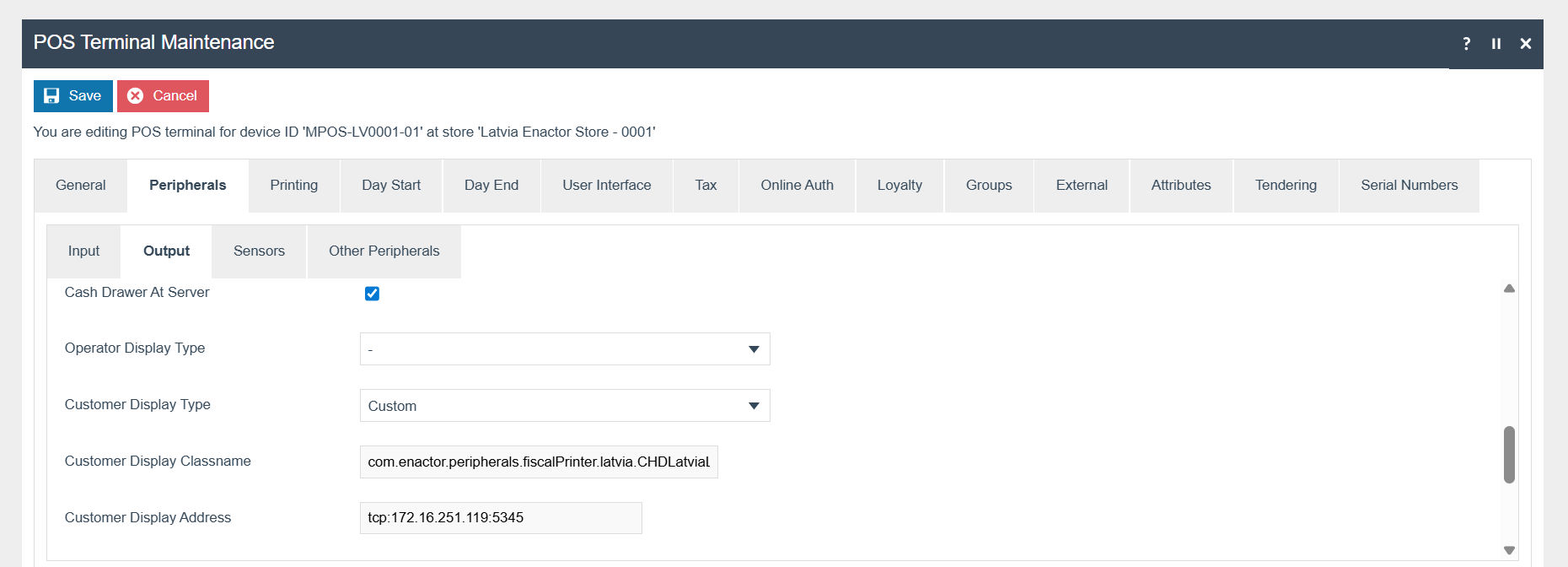 Add the Customer Display Classname as com.enactor.peripherals.fiscalPrinter.latvia.CHDLatviaLineDisplay