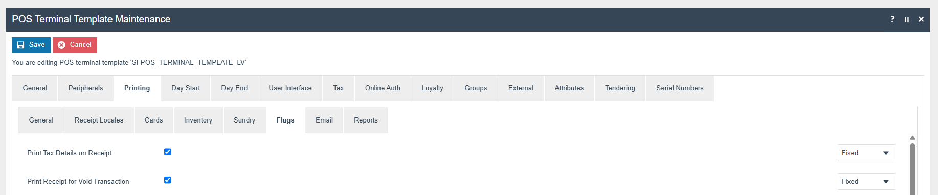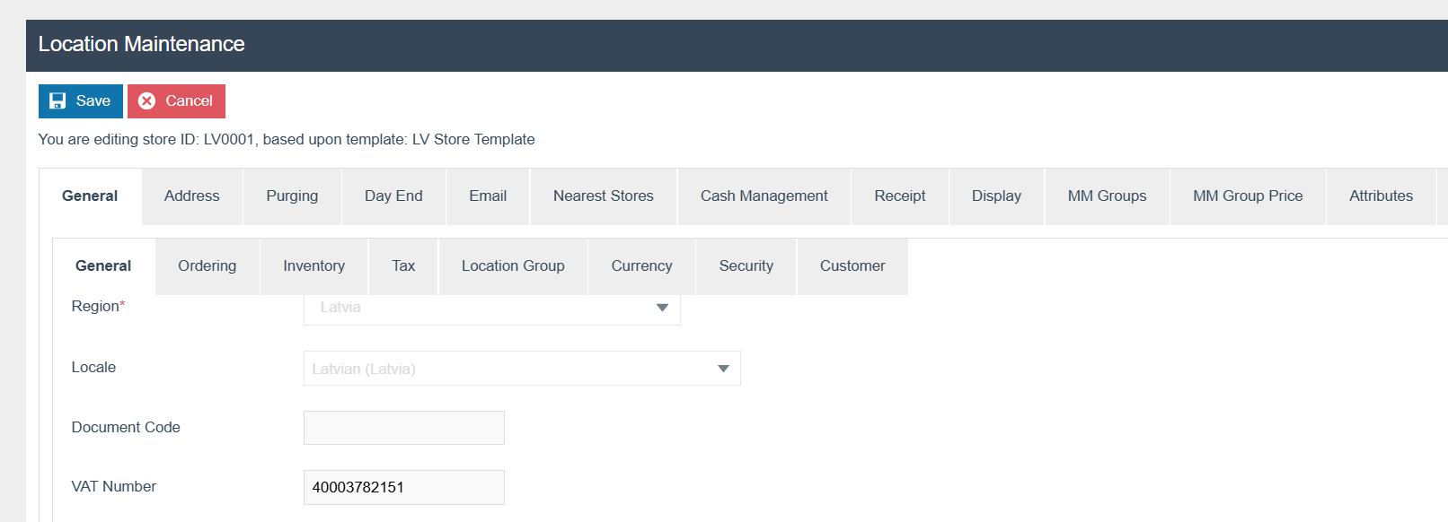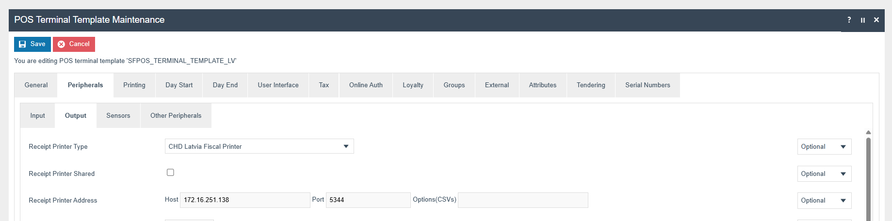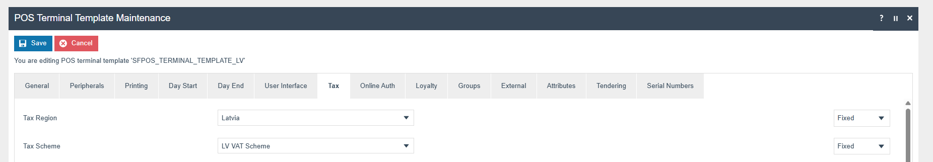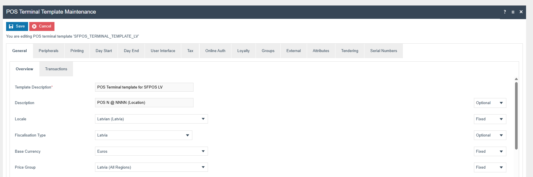 The POS Terminal Template used by all devices in Latvia must be configured to have the Fiscalisation Type set to Latvia. Currency should be set to Euro and Locale to Latvia.