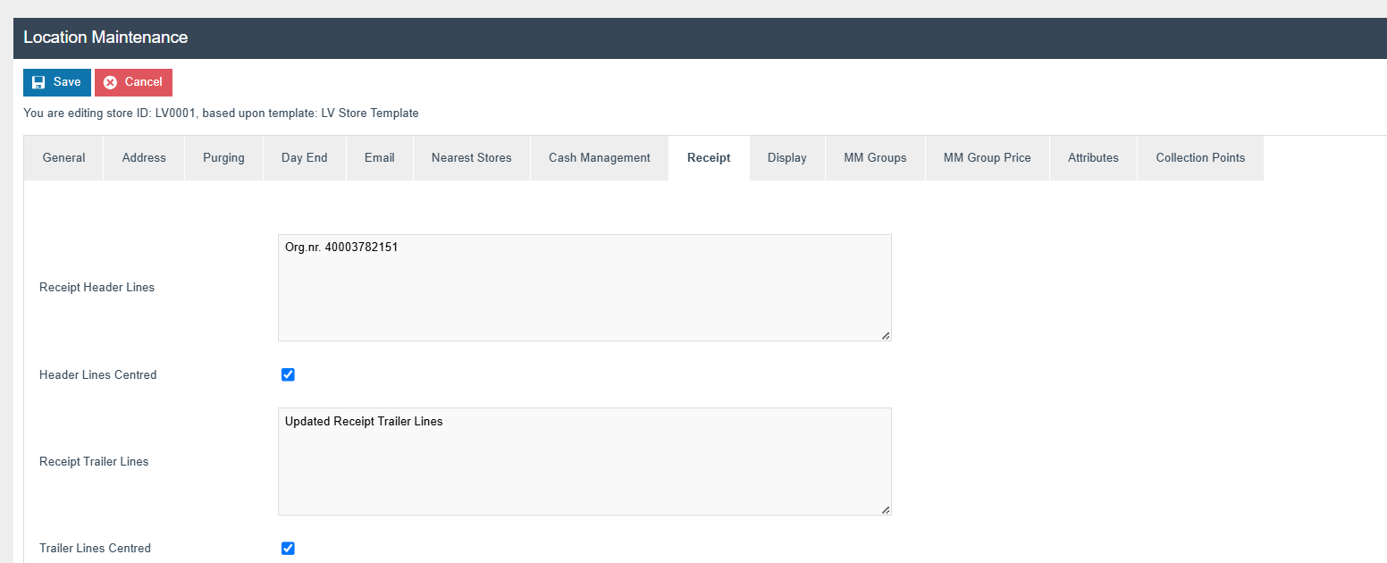 Location Maintenance → Receipt tab → Receipt Header Lines
