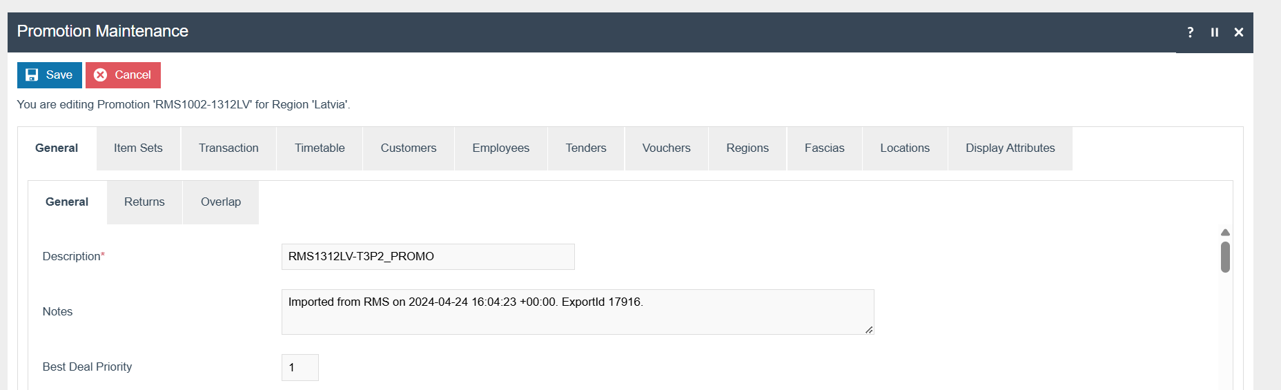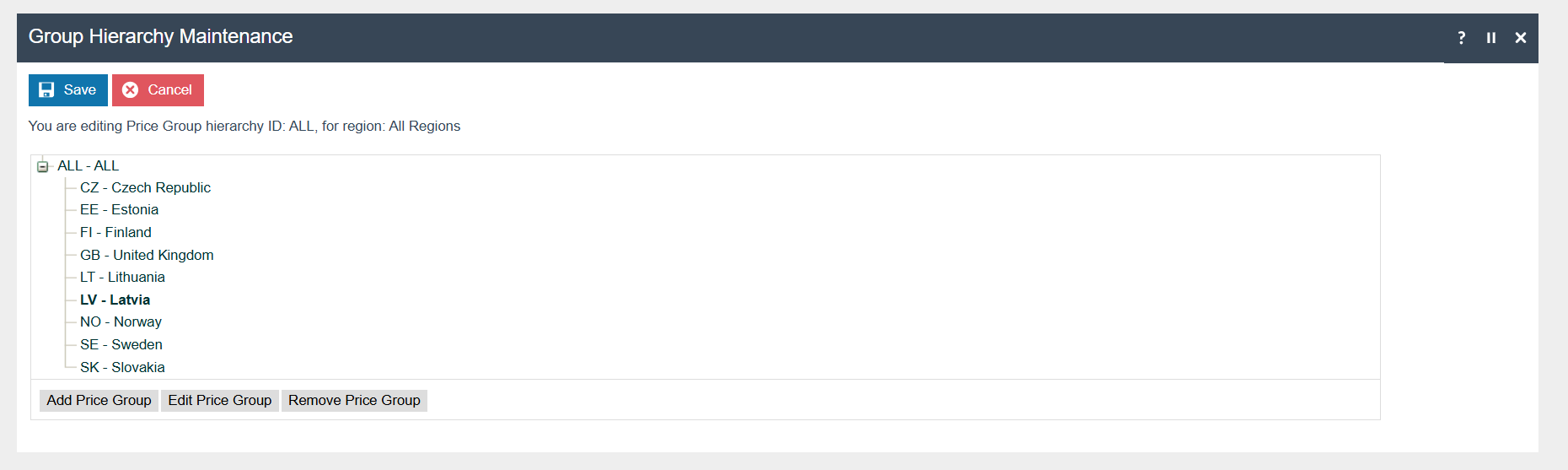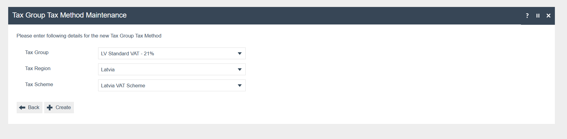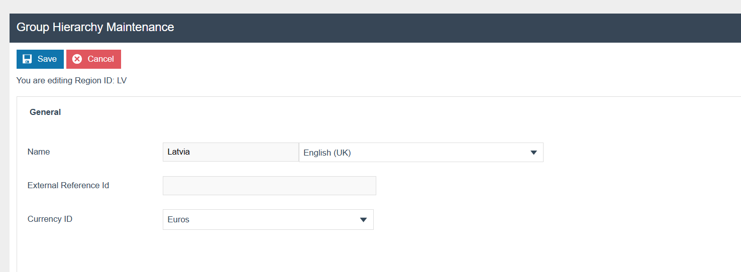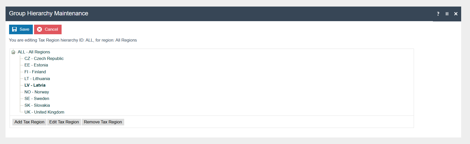 If it does not already exist, a Tax Region for Latvia should be created within the Tax Region Group Hierarchy. It should have the ID: “LV” and the Name: “Latvia”, it is not necessary to configure an External Reference ID.