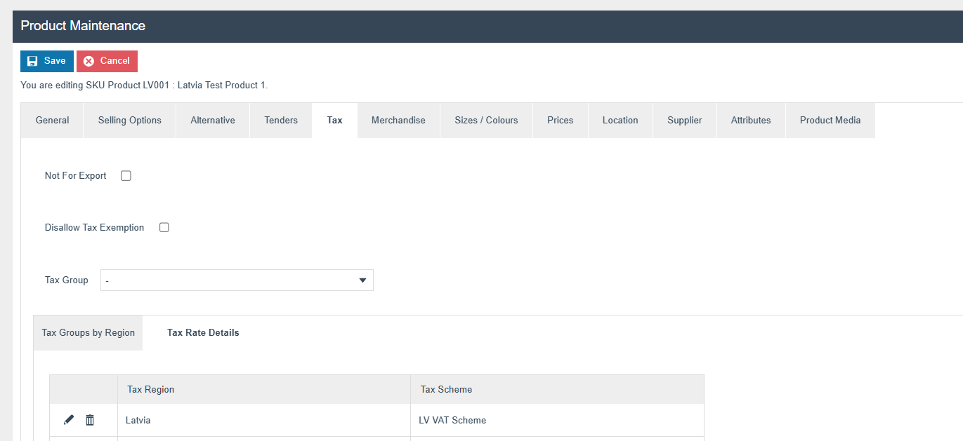 The following tax configurations should be configured against the products and broadcast to the appropriate Latvia devices.A tax group can be defined either to configure the tax group itself, associate it with a tax region, or configure only tax rate details.