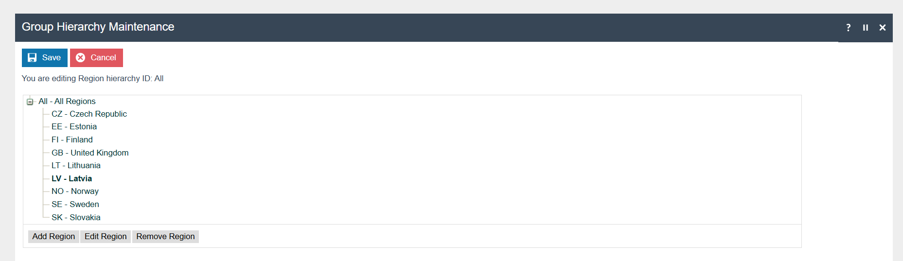 The region must be configured to continue the other configurations related to the fiscalisation. Region for Latvia should be created within the Region Group Hierarchy.