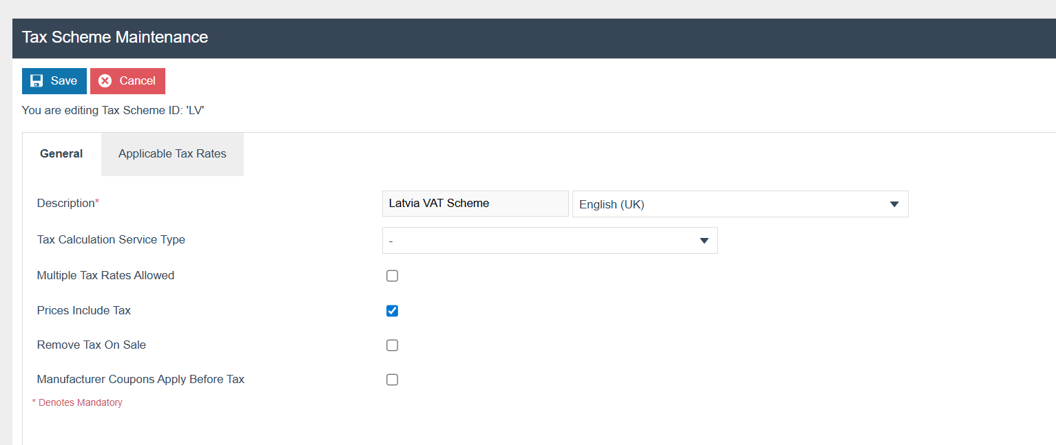 The following tax scheme should be configured and broadcast to the appropriate Latvia devices. Make sure to add all the Tax Rates related to Latvia in the Applicable Tax Rate Tab as well.
