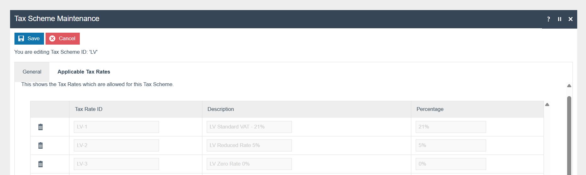 Add all the applicable tax rates (LV-01, LV-02, LV-03) in the Applicable Tax Rates Tab
