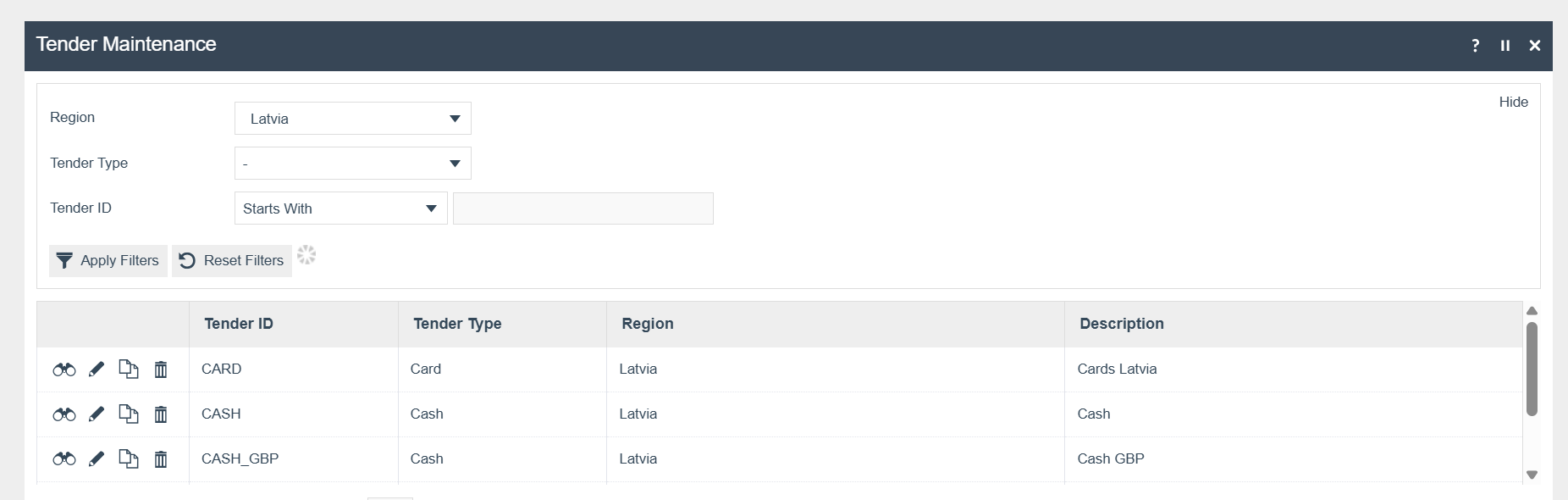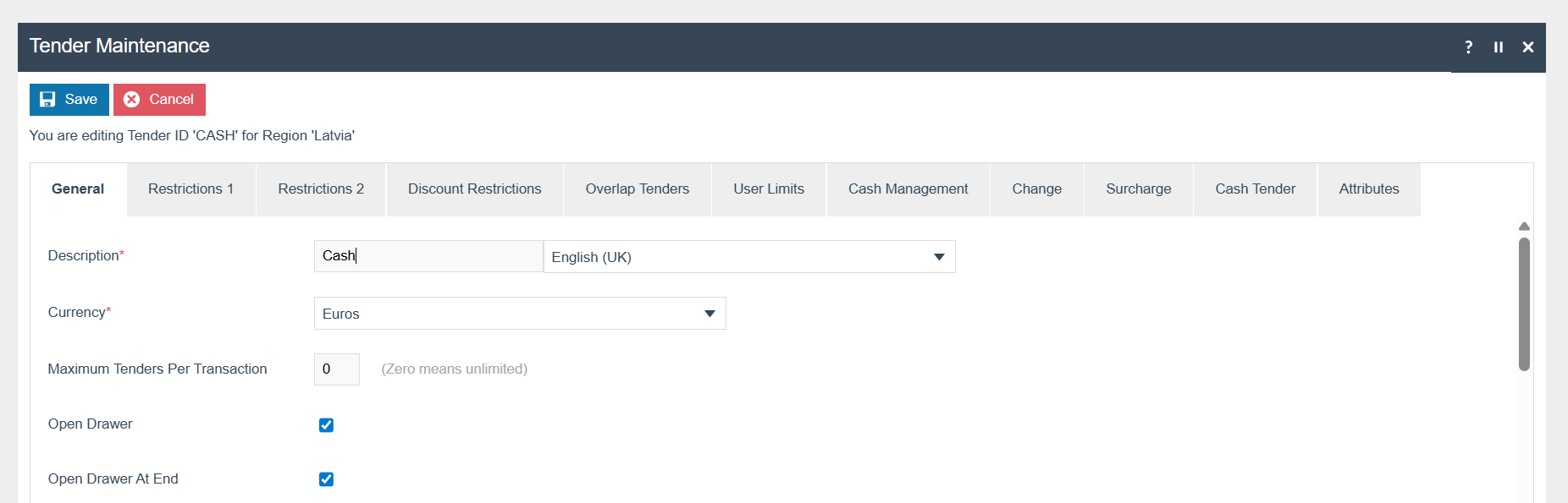The following Tenders should be configured and broadcast to the appropriate Latvia devices. (Configure Card and Cash_GBP if necessary)