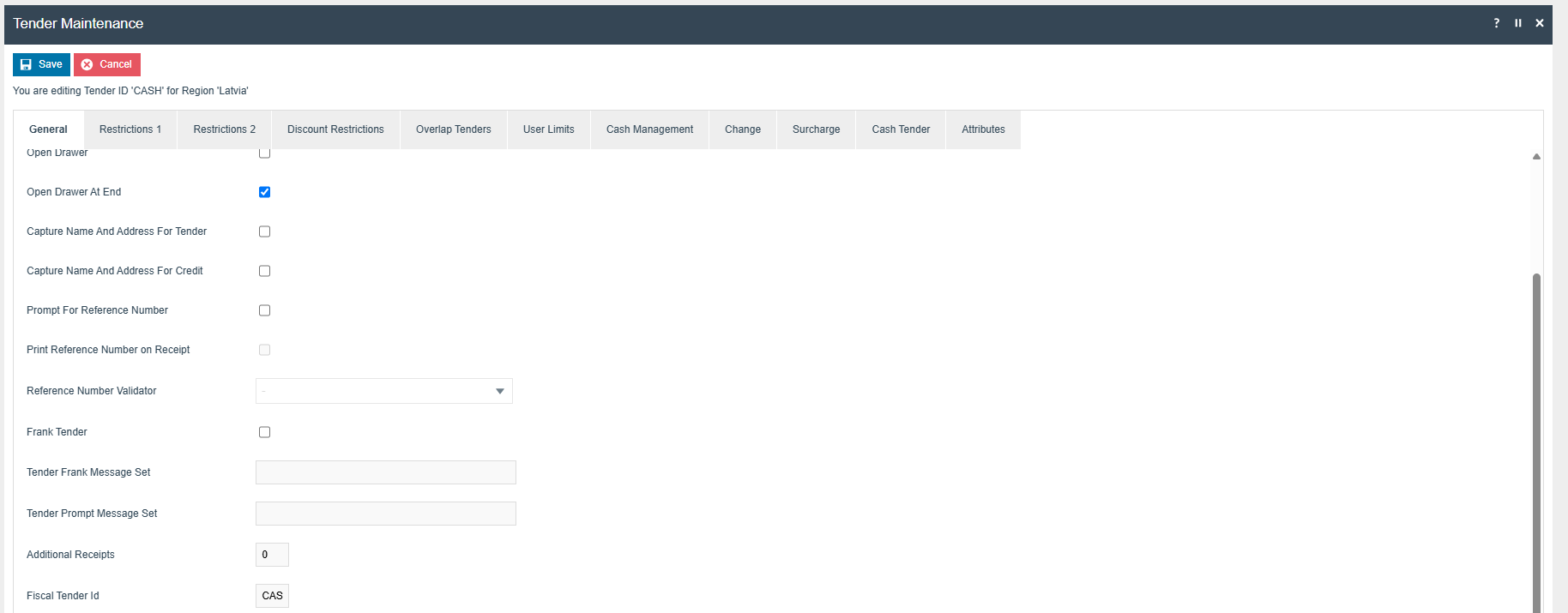Check Open Drawer and Open Drawer At End for the tender that needs to open the cash drawer