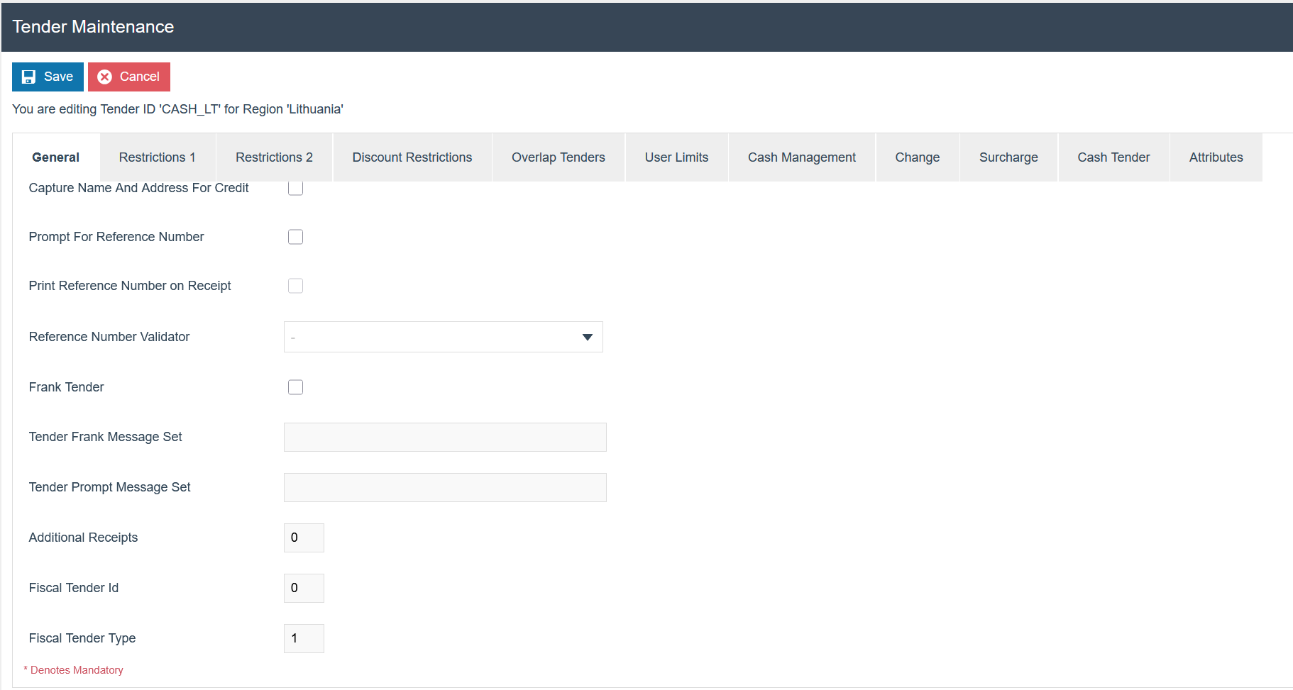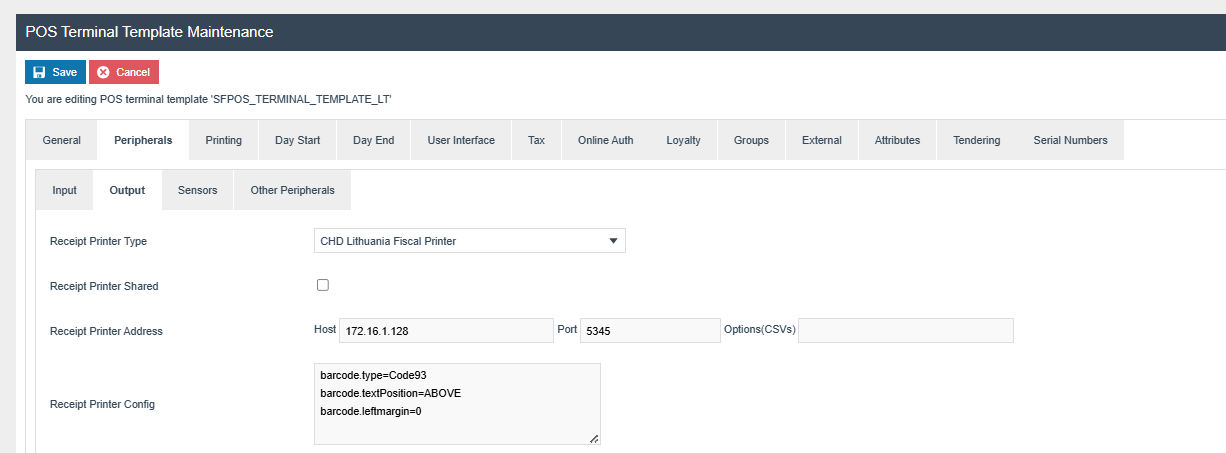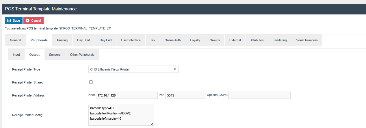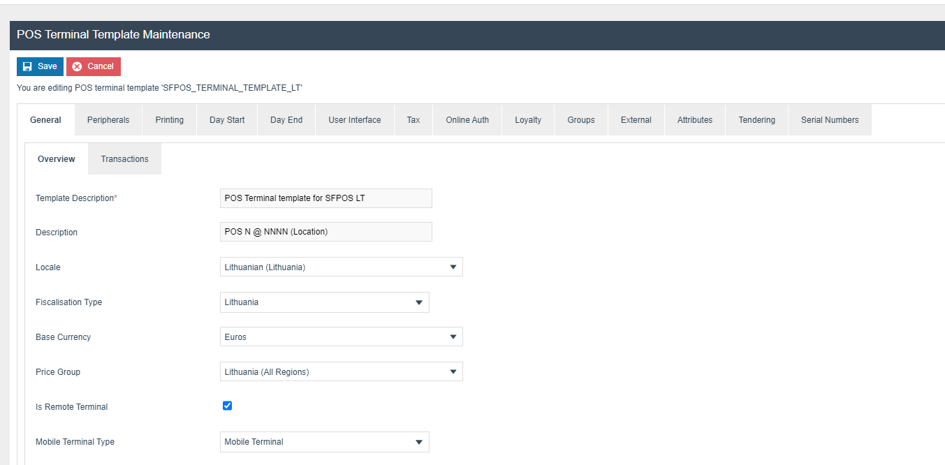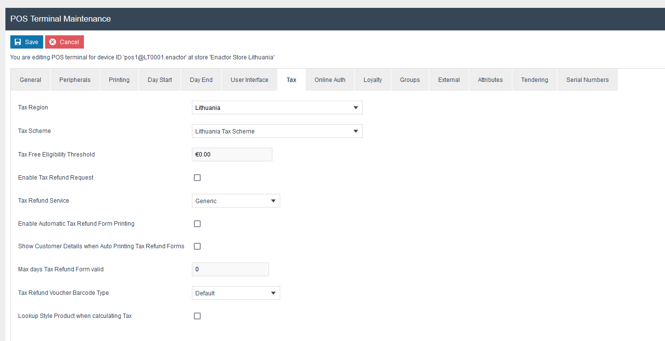The POS Terminal Template used by all devices in Lithuania must be configured to have the Fiscalisation Type set to Lithuania. Currency should be set to Euro and Locale to Lithuania. If a POS terminal configuration with the Fiscalisation type set to Lithuania is broadcast to a POS device that does not have the Lithuania fiscal module installed the POS will fail to start. Similarly if a POS device with the Lithuania fiscal module installed is configured with anything but the Lithuania Fiscalisation type the POS will also fail to start. This is to ensure that only versions of the enactor solution that have been certified for use in Lithuania are used in Lithuania.