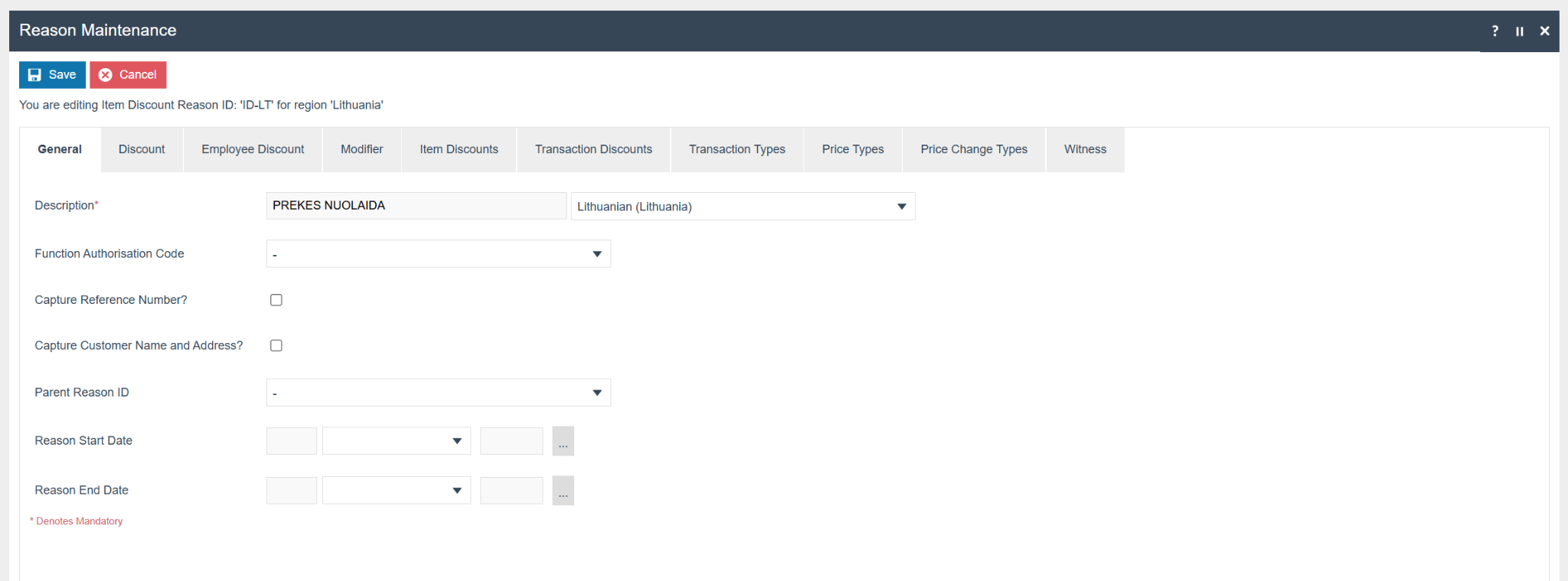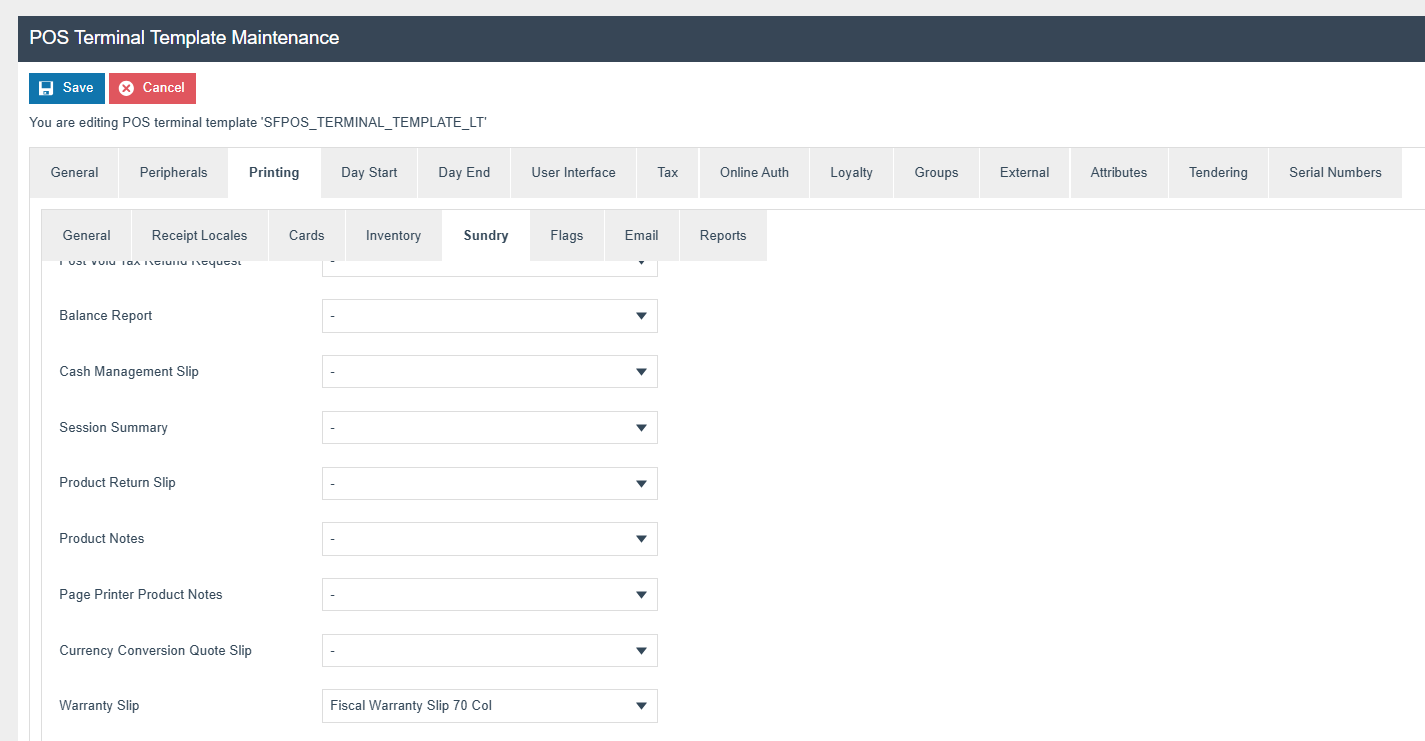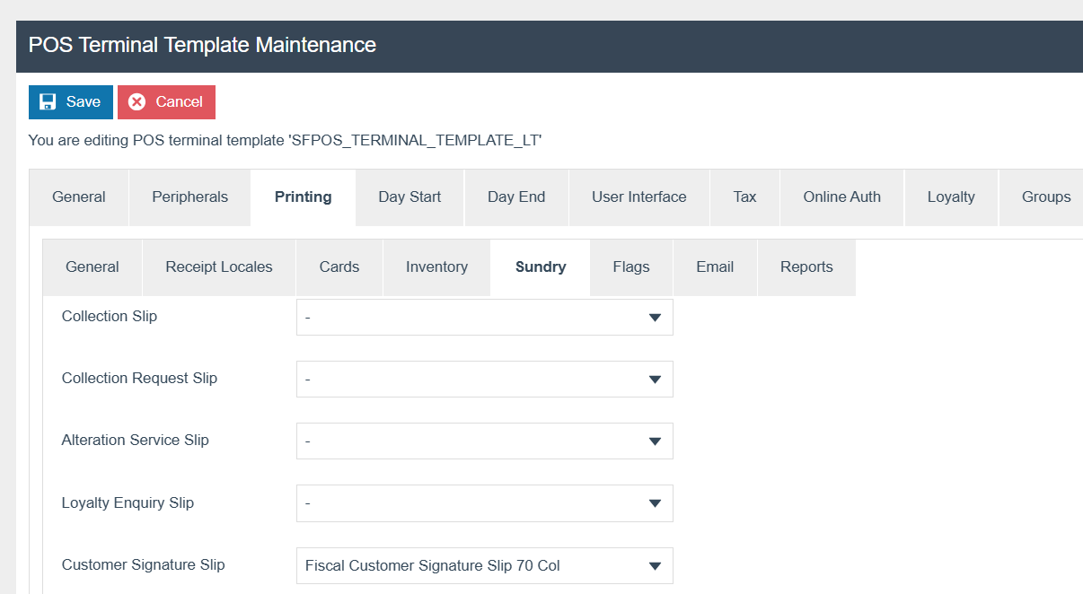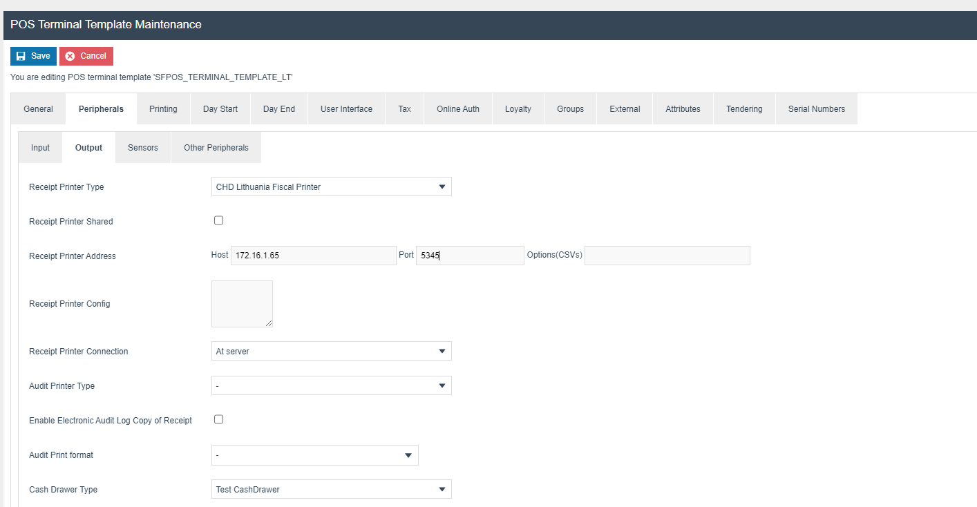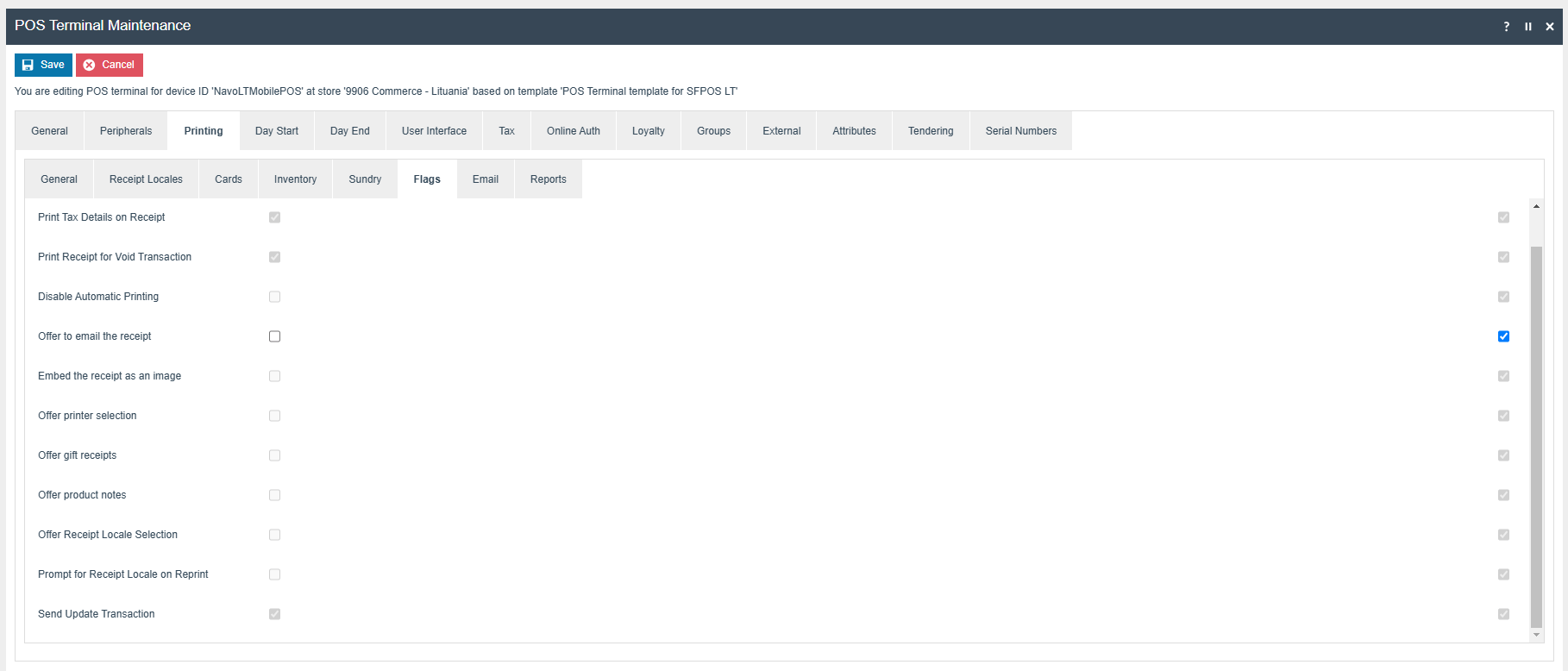 The POS Terminal Template used by all devices in Lithuania must be configured to have the Fiscalisation Type set to Lithuania. Currency should be set to Euro and Locale to Lithuania. If a POS terminal configuration with the Fiscalisation type set to Lithuania is broadcast to a POS device that does not have the Lithuania fiscal module installed the POS will fail to start. Similarly if a POS device with the Lithuania fiscal module installed is configured with anything but the Lithuania Fiscalisation type the POS will also fail to start. This is to ensure that only versions of the enactor solution that have been certified for use in Lithuania are used in Lithuania.