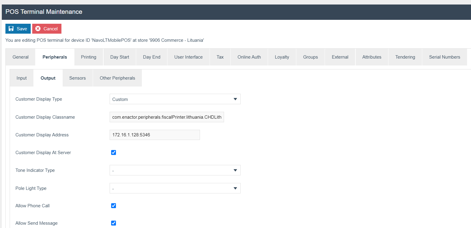Set Customer Display Classname to com.enactor.peripherals.fiscalPrinter.lithuania.CHDLithuaniaLineDisplay in the configuration
