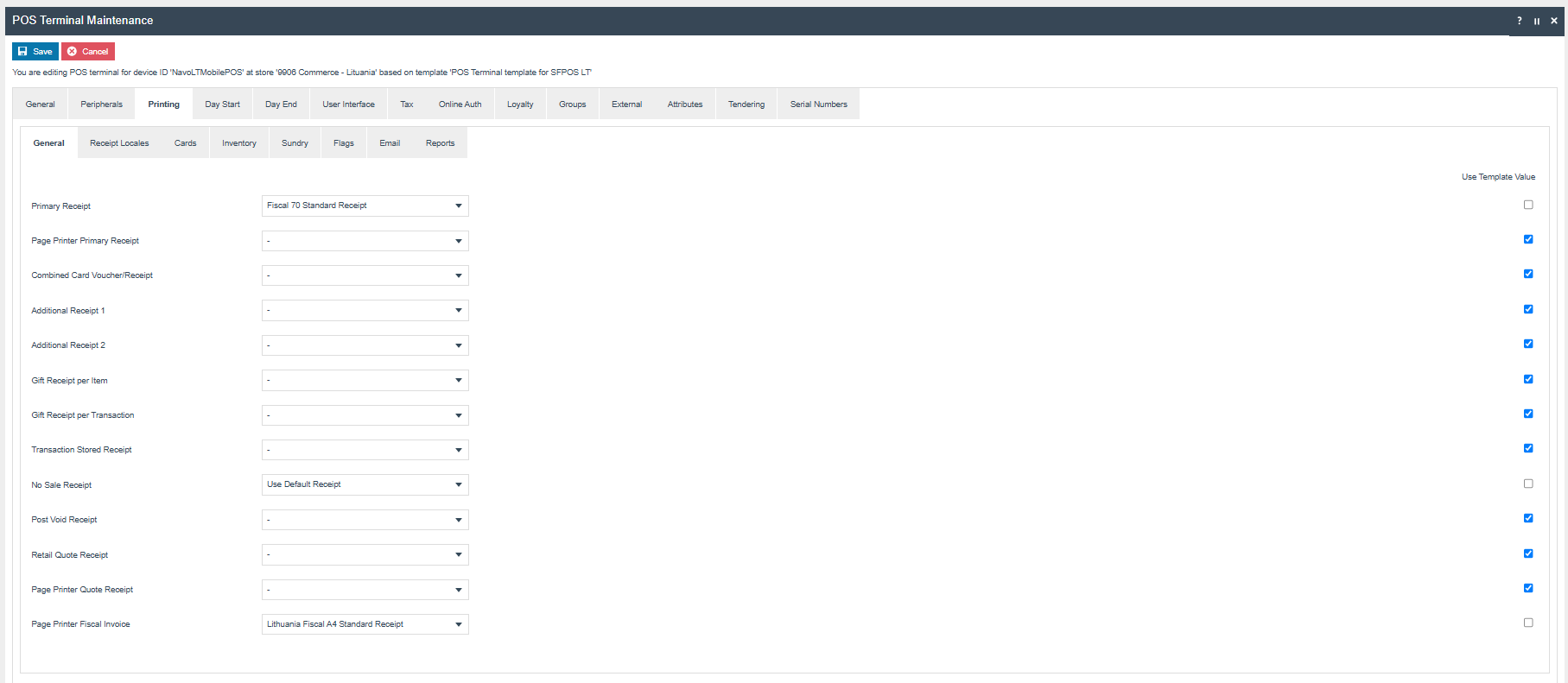 The Primary Receipt should be set to Fiscal 70 Standard Receipt and Page Printer Fiscal Invoice should be set to Lithuania Fiscal A4 Standard Receipt.