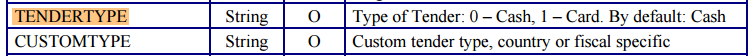 If the values are not set, by default TENDERTYPE = “0” and CUSTOMTYPE = “1” will be sent to the printer.