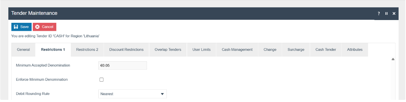 For cash tenders, set the Minimum Accepted Denomination to €0.05, and in the Debit Rounding Rule dropdown, select 'Nearest' under the Restrictions 1 tab.