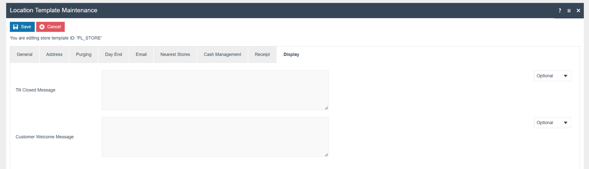 The till welcome and till closed message should be provided on either the location template or the location maintenance depending on if you would like different messages in each store.