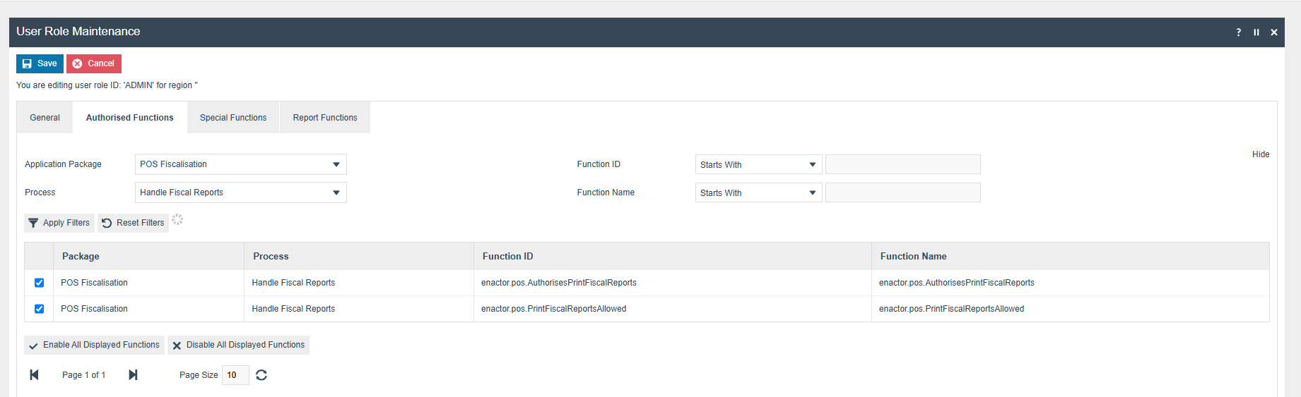 To configure this, go to User Role Maintenance in the Enactor Manager (EM). Based on your Role ID, navigate to the Authorised Functions tab, select Pos Fiscalisation as the Application Package, and set the Function ID to enactor.pos.AuthorisesPrintFiscalReports. Then enable the function.