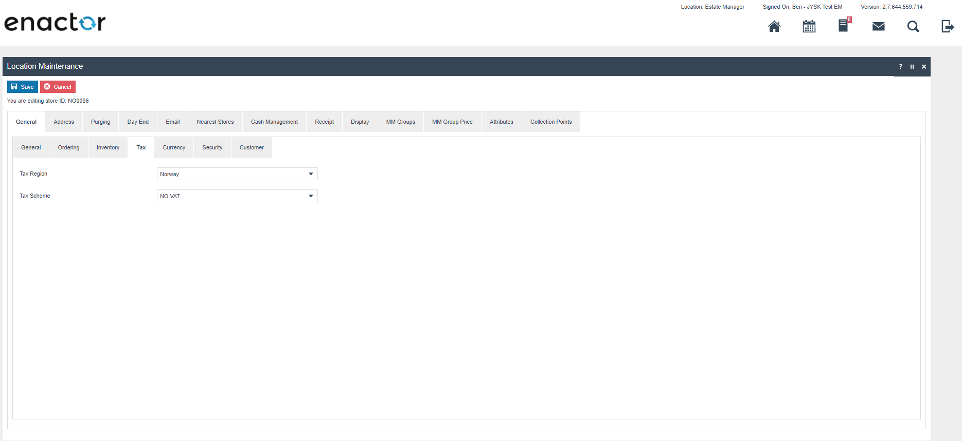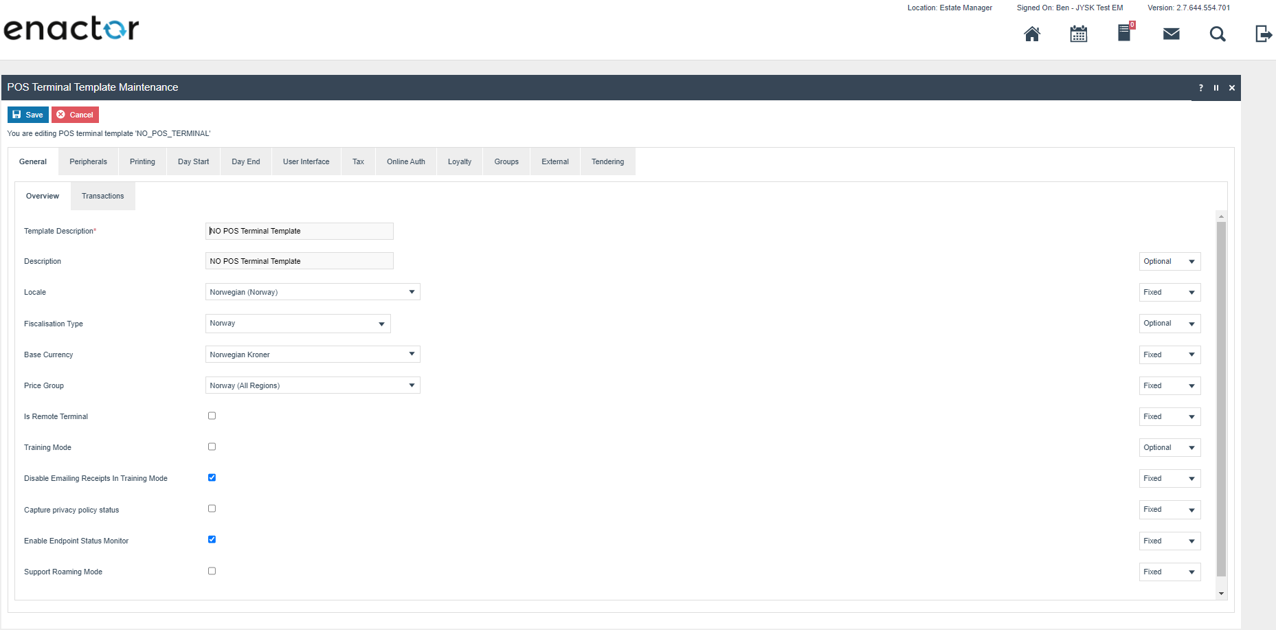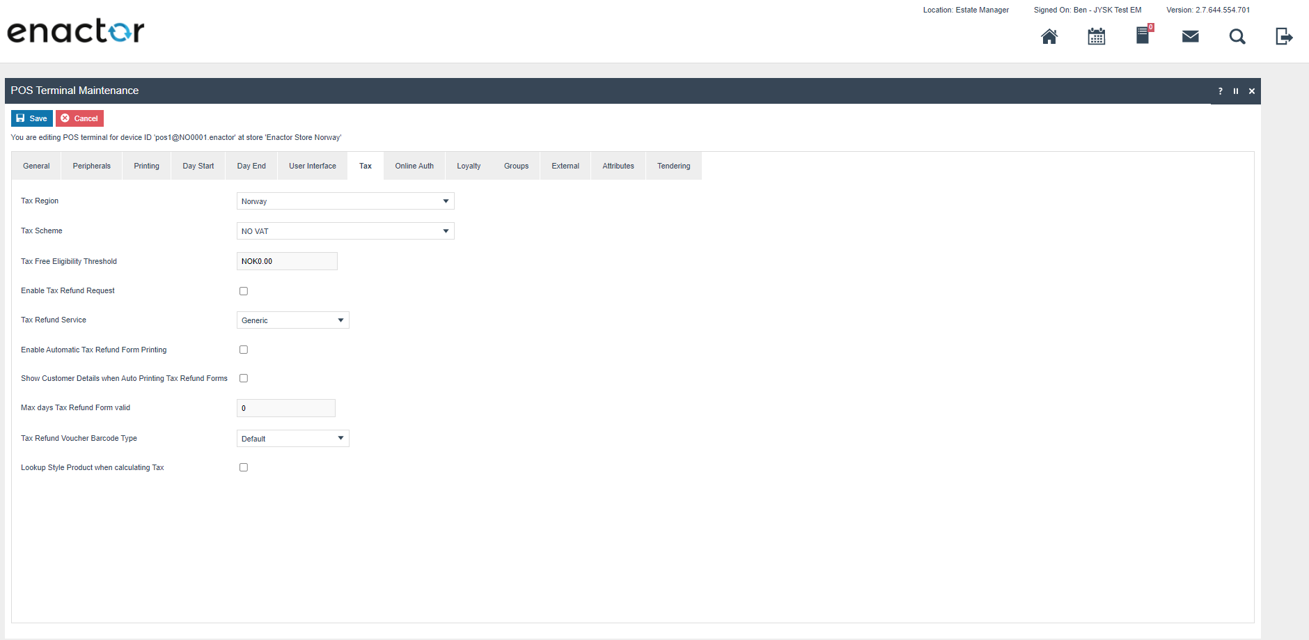 The enactor system is distributed, there is a central component called the Estate Manager (EM) where configuration is performed and which is the master data store for the system configuration. Configuration performed on the EM must be broadcast to the POS devices before it takes effect. The system is extremely configurable but only a small subset of this configuration is required to ensure that the Norwegian Fiscal legislation is complied with. This required configuration is described later in this document and there are further how to guides available which described the other configuration options available see https://insights.enactor.co/ The critical configuration option for Norway is the fiscalisation type on the POS terminal, when this is set to Norway, the rules of the Norwegian fiscal legislation will be applied on that device (POS). In case the EM is used to configure the system in a way that would not be compliant in Norway, the POS will be prevented from starting where its fiscalisation type is set to Norway. Once a POS has been configured as a Norwegian fiscal POS it is not possible to change or remove the fiscalisation type.