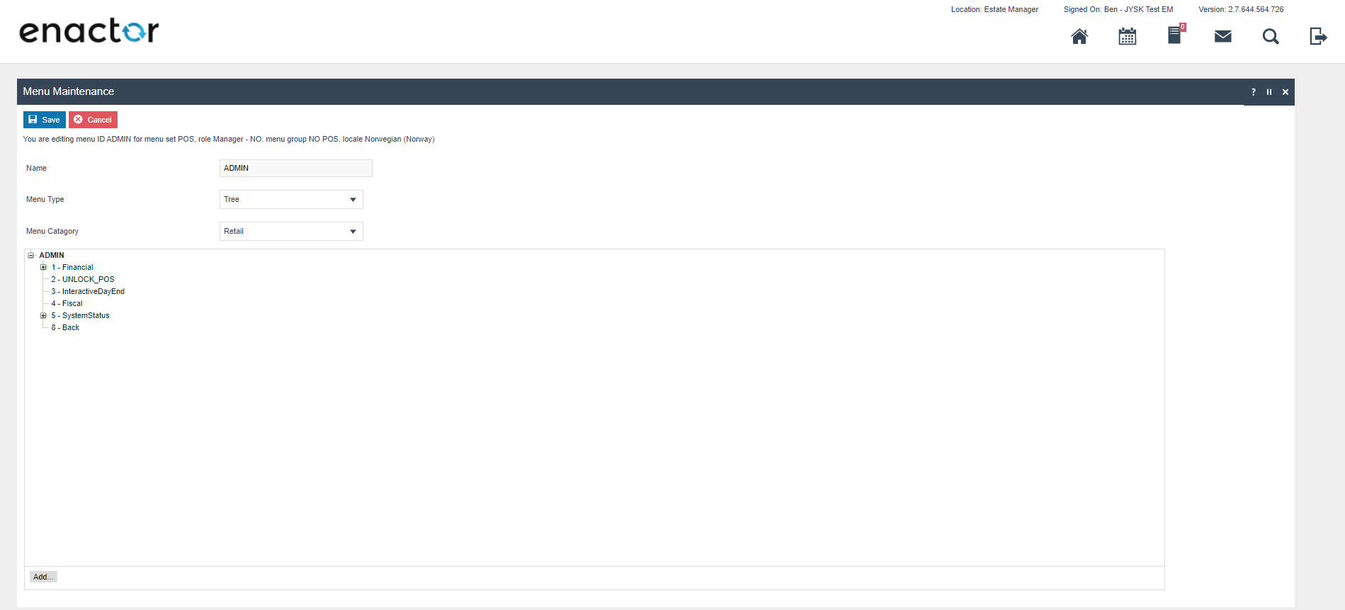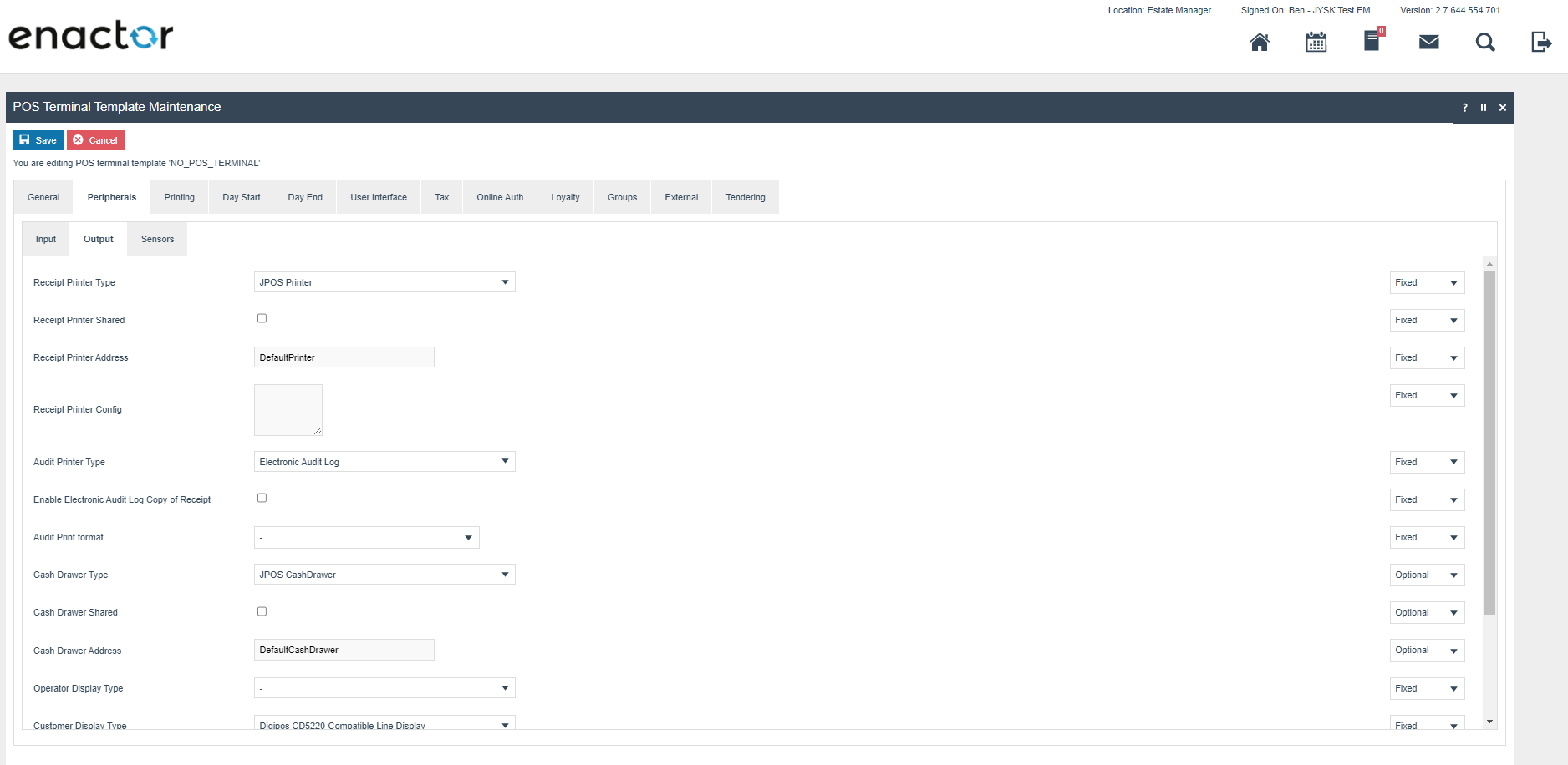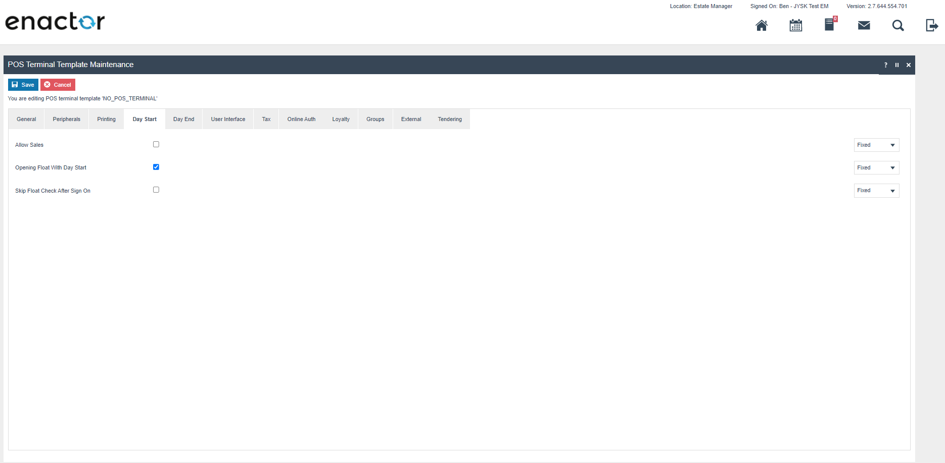 The enactor system is distributed, there is a central component called the Estate Manager (EM) where configuration is performed and which is the master data store for the system configuration. Configuration performed on the EM must be broadcast to the POS devices before it takes effect. The system is extremely configurable but only a small subset of this configuration is required to ensure that the Norwegian Fiscal legislation is complied with. This required configuration is described later in this document and there are further how to guides available which described the other configuration options available see https://insights.enactor.co/ The critical configuration option for Norway is the fiscalisation type on the POS terminal, when this is set to Norway, the rules of the Norwegian fiscal legislation will be applied on that device (POS). In case the EM is used to configure the system in a way that would not be compliant in Norway, the POS will be prevented from starting where its fiscalisation type is set to Norway. Once a POS has been configured as a Norwegian fiscal POS it is not possible to change or remove the fiscalisation type.