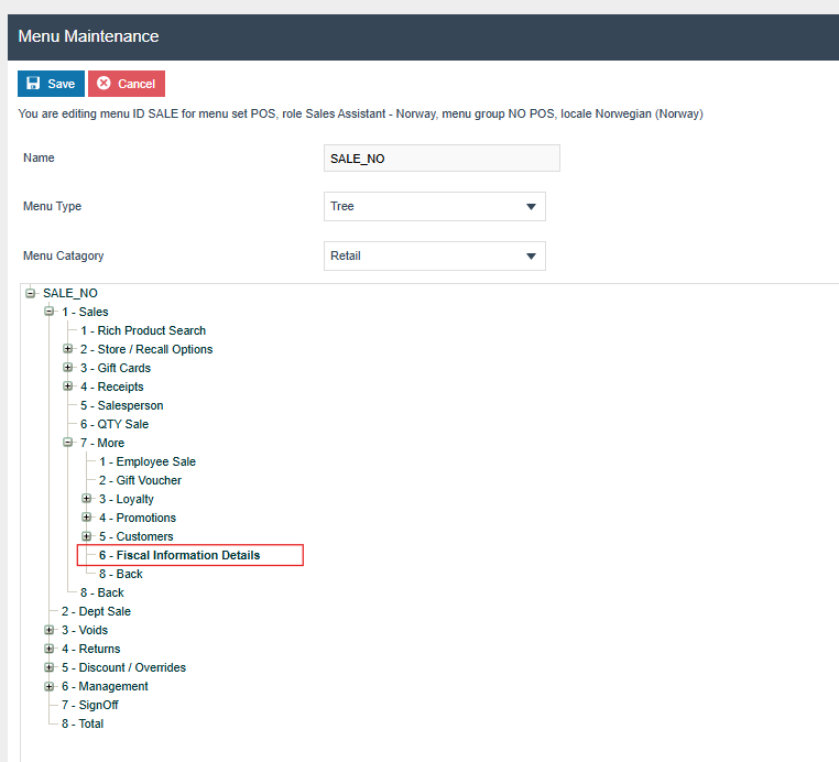 At an appropriate point within the Norwegian POS menu structure, suggested on the Admin menu, a fiscalisation menu with the following items will need to be configured and broadcast to the Norwegian POS devices. This menu will be used for performing X and Z reports. Although access to this report is controlled with the above privilege it may be beneficial to only configure this button on the menu for the appropriate role, i.e. if a manager will perform this function it is only available on the manager menu.