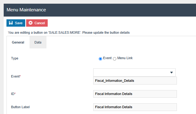 Create a menu button in SALES menu with event “Fiscal_Information_Details”