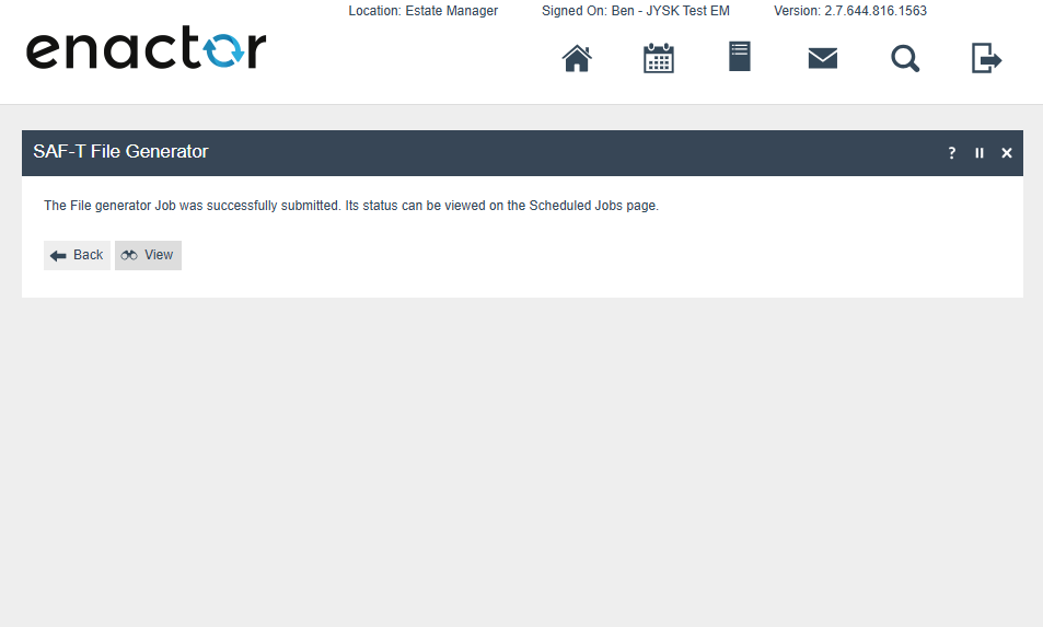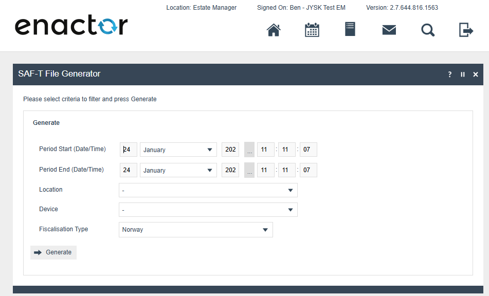 From the estate manager it is possible to trigger the production of a SAF-T file. This should only be required if requested by the Tax Authorities at the time of an Audit. However, it would be pragmatic to produce this report on a regular schedule to maintain a second record of transactions along with the database and its backups in the event of a total loss of the enactor database and its backups also failing.