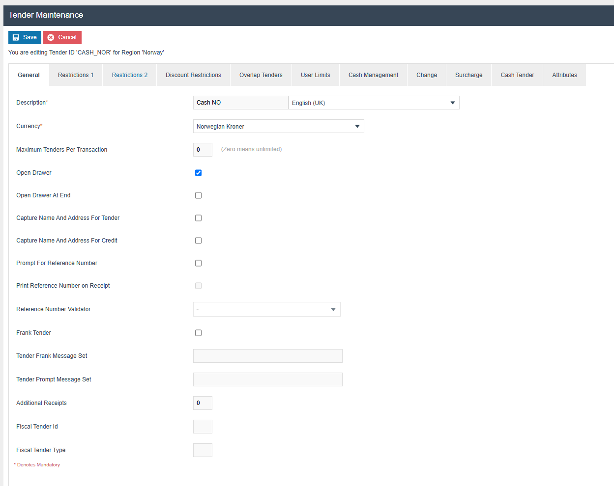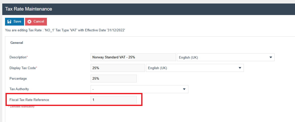 The following tax configurations should be configured against the products and broadcast to the appropriate Norway devices. A tax group can be defined to either configure the tax group or have a tax group by tax region.
