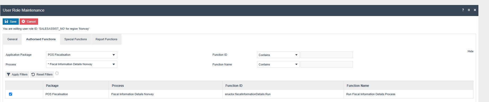 To configure the required settings for the new screen that include fiscalisation type and Fiscal Module Version, select the relevant User Role ID, such as "Sales Assistant." Edit the chosen User Role ID and navigate to the "Authorised Functions" section. From there, select "POS Fiscalisation" as the Application Package from the dropdown menu. Next, choose "Fiscal Information Details Norway" as the Process and enable the "Run Fiscal Information Details Process" option