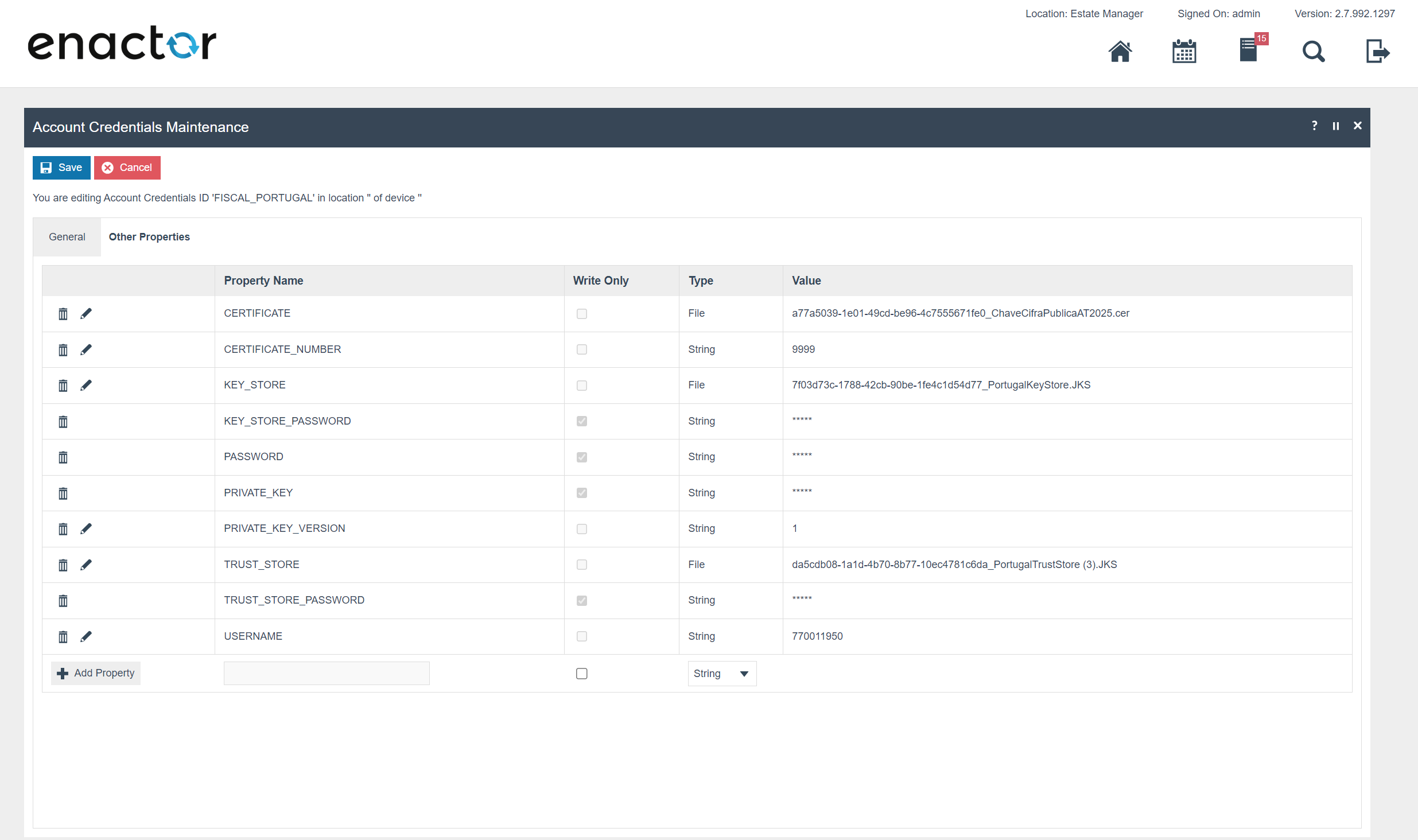 To achieve this, an approved person at Enactor will generate the key pair and then encrypt the private key in an account credential using the Enactor system key which is known only to Enactor. Account Credentials are an Entity that is used within the Enactor solution for securely sharing credentials. This account credential can then be shared with the customer as an XML file, imported into their system and broadcast to all Portuguese POS devices. When a transaction needs to be signed on the POS (which has the System Key securely embedded within it) it can decrypt the private key and sign the transaction. Enactor has taken industry standard steps to ensure that both the system key and the decrypted private key are protected whilst they are being used.