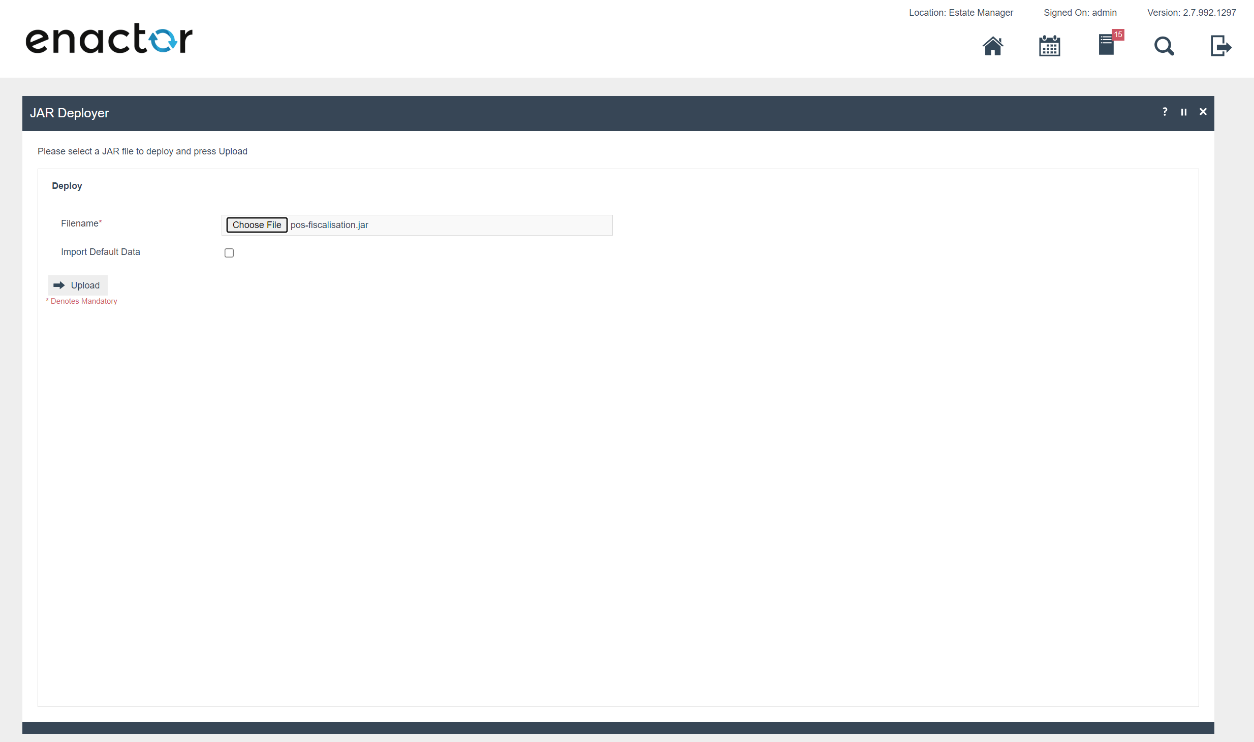 The pos-fiscalisation.jar taken from a POS that has the latest version of the Portuguese fiscal solution installed should be deployed to the EM using the JAR Deployer.