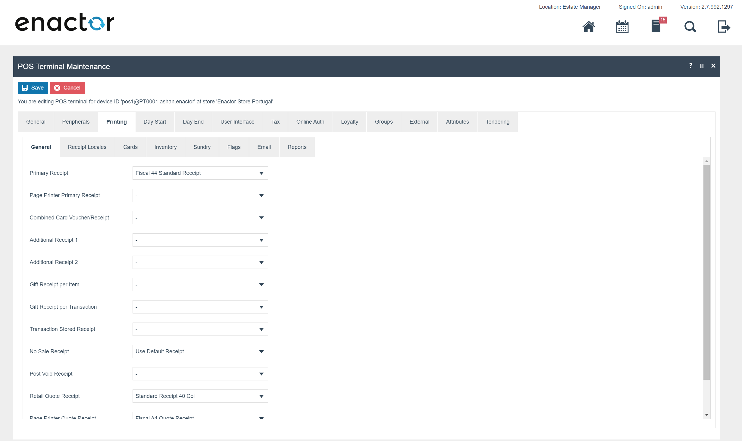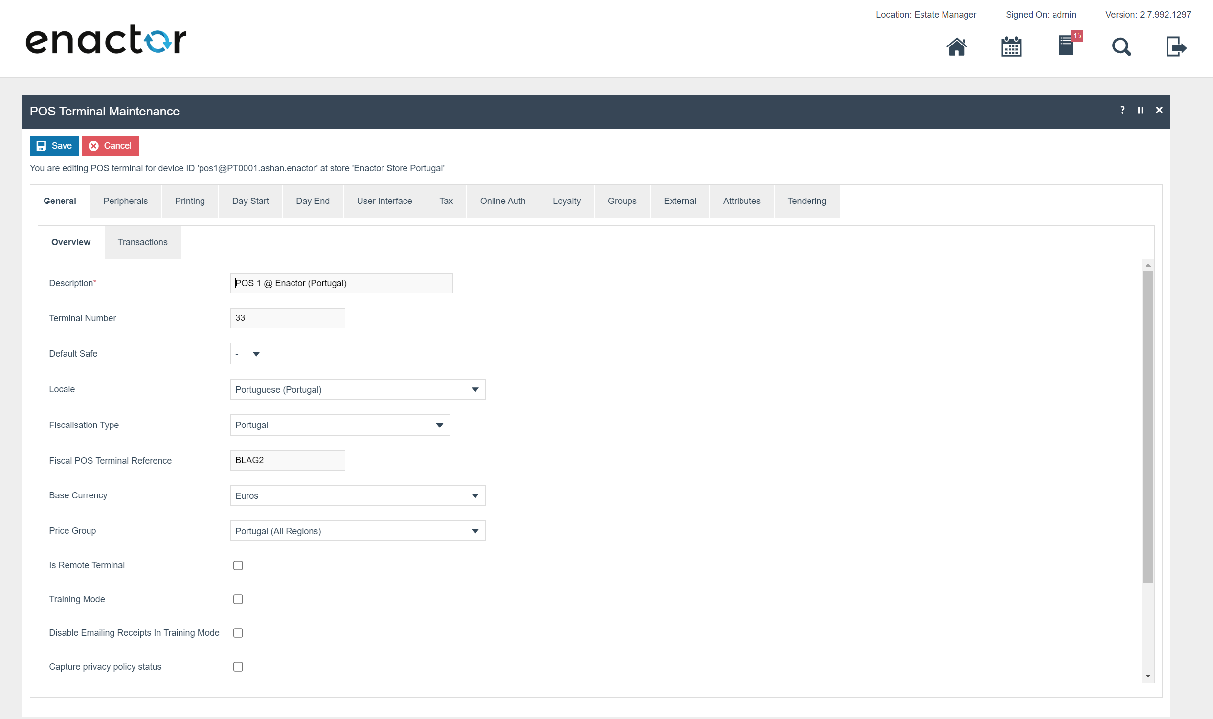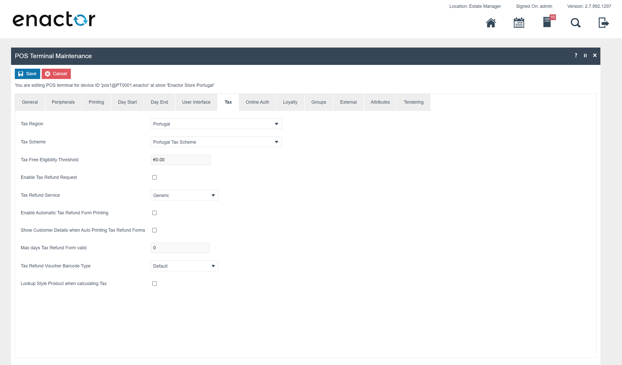 Note: As per usual practice POS Terminal Templates should be used to ensure that configuration is consistent across Portuguese POS devices. For more details see the Enactor Books.