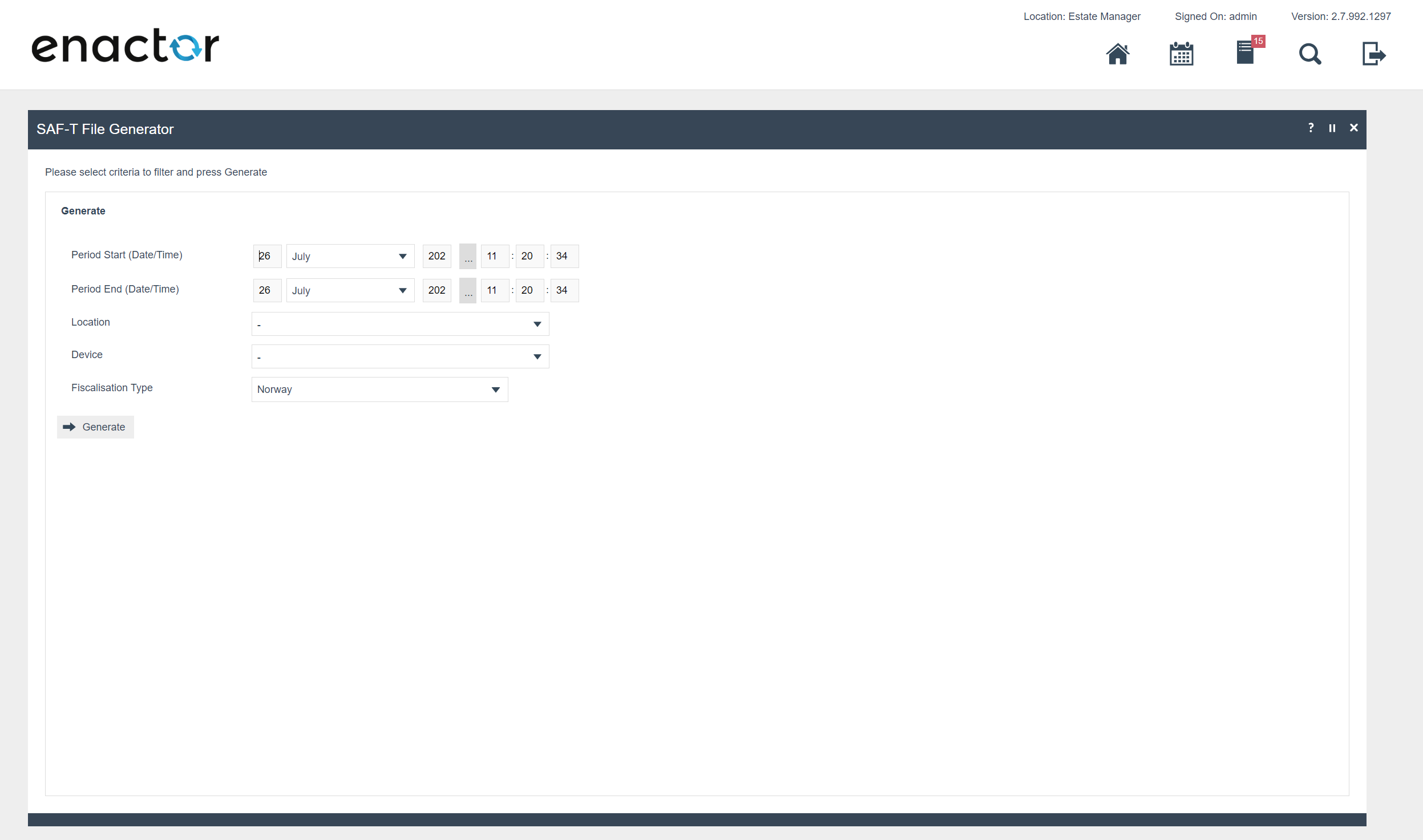 Periodically retailers are required to produce a SAF-T file and share this with the Tax Authority on their online portal. This is done from the Estate Manager using the SAF-T File Generator, which is available at: