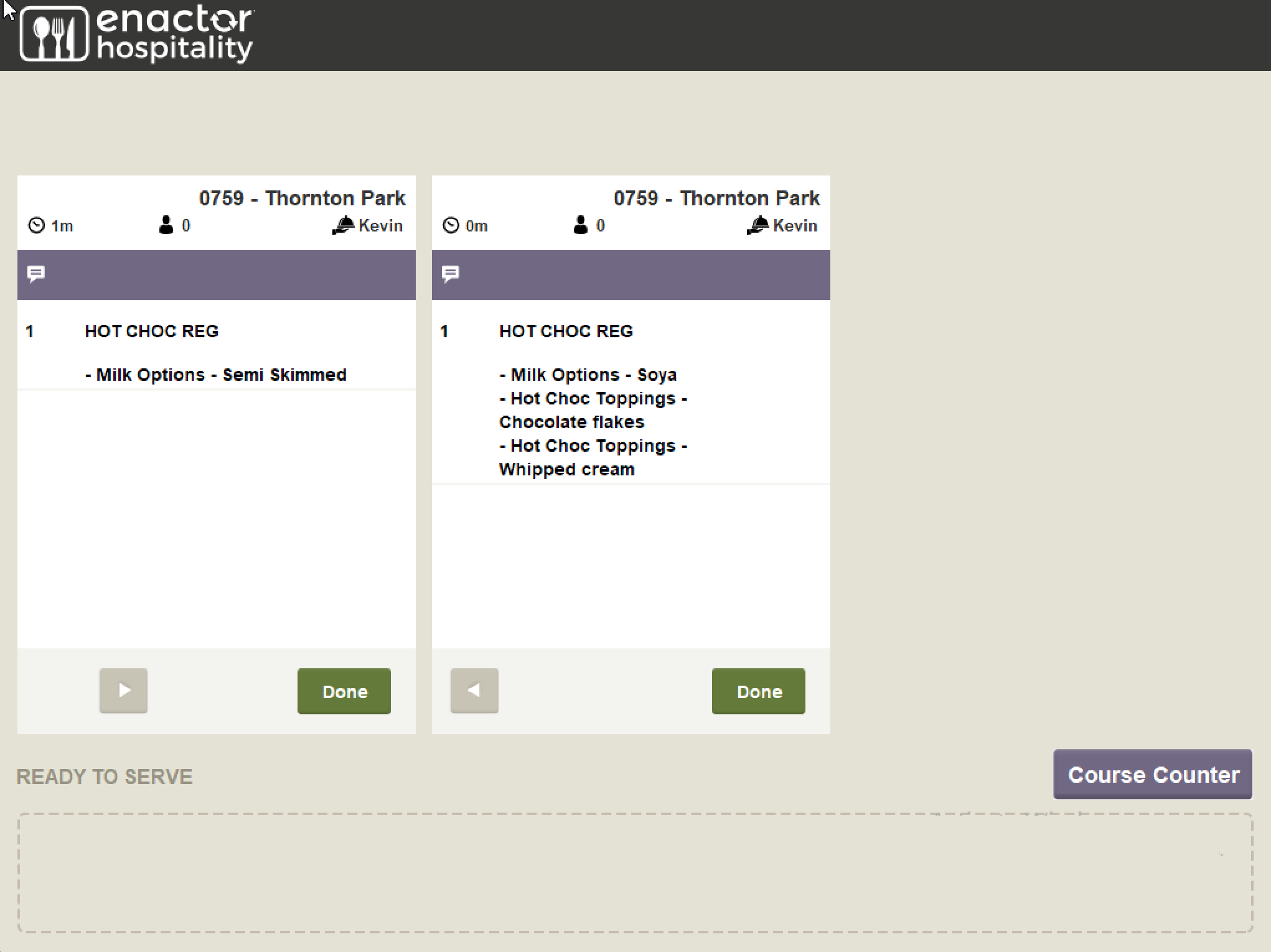 Enactors kitchen display offers staff a clear overview of current and upcoming orders on screens in the kitchen.