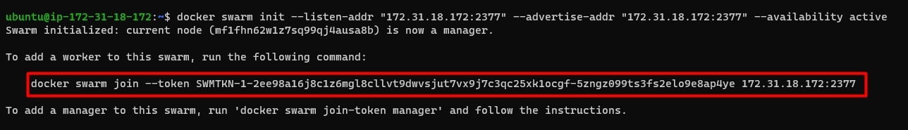 Once you initiate the swarm you will be given instructions on how to join workers and managers to the swarm. Make sure to copy it since it will contain the join token for connecting workers. Follow the instructions to connect managers and workers successfully.