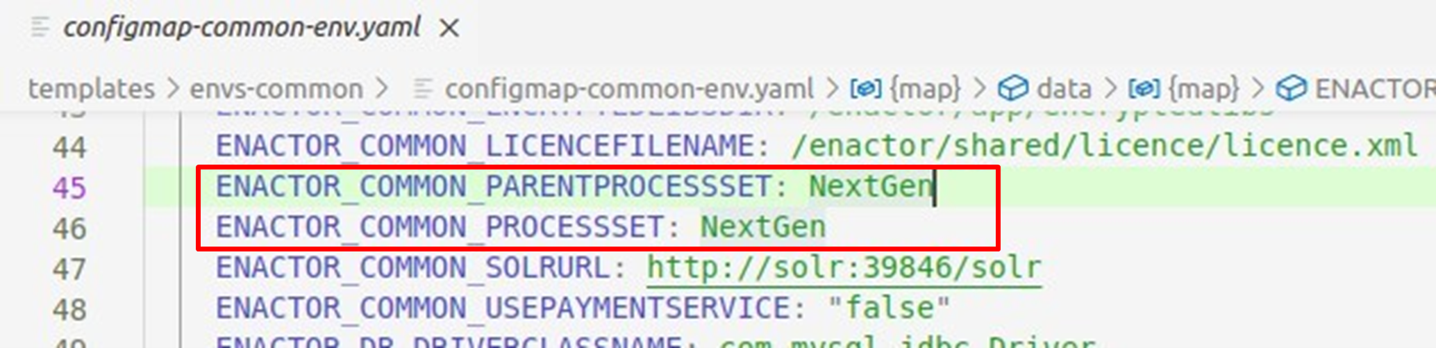 Any changes to Process Sets should also be changed as required. This can be commonly set by changing the ENACTOR_COMMON_PARENTPROCESSSET and ENACTOR_COMMON_PROCESSSET attributes in the ./templates/envscommon/configmap-common-env.yaml.