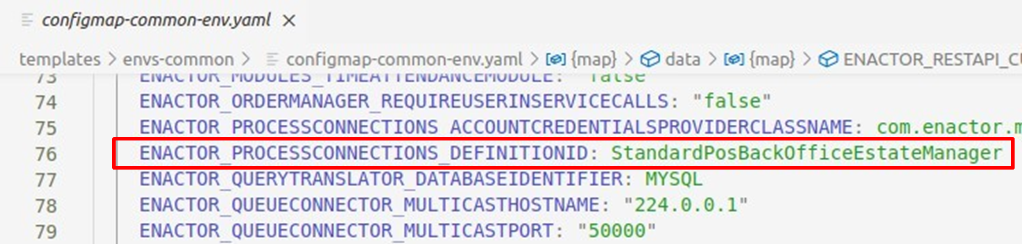 ENACTOR_PROCESSCONNECTIONS_DEFINITIONID in the ./templates/envs-common/configmap-common-env.yaml file to match with the name of your Process Connection.