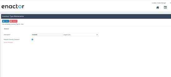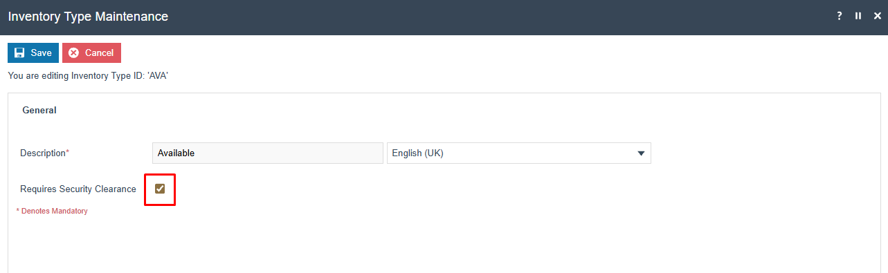 If an inventory type should be restricted, the Requires Security Clearance checkbox must be checked to enforce validation through the security API.